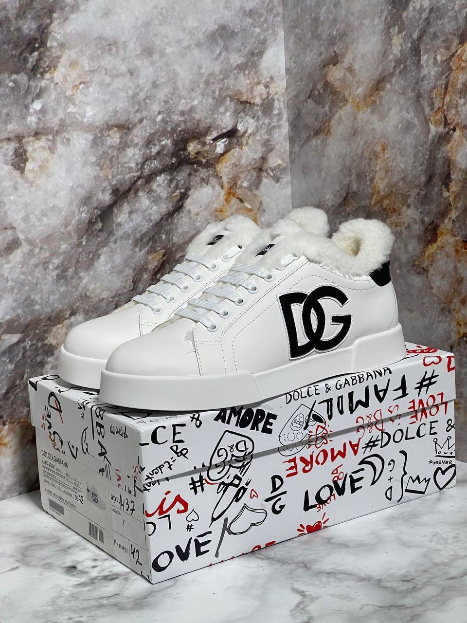 Кеды утепленные Dolce & Gabbana LUX-81701 выполнены в белом цвете с меховой отделкой внутри, что делает их идеальным выбором для холодной погоды. Эти кеды сочетают в себе элементы спортивного и повседневного стиля, подходящие для разных ситуаций.