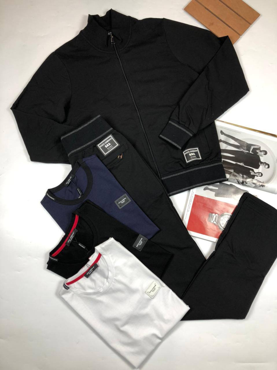 Стильный мужской костюм Dolce & Gabbana LUX-52700 – это идеальное сочетание комфорта и элегантности. Костюм включает в себя черную куртку-бомбер на молнии с высоким воротником и спортивные брюки. В комплект также входят футболки темно-синего, черного и белого цветов, которые отлично дополняют образ.