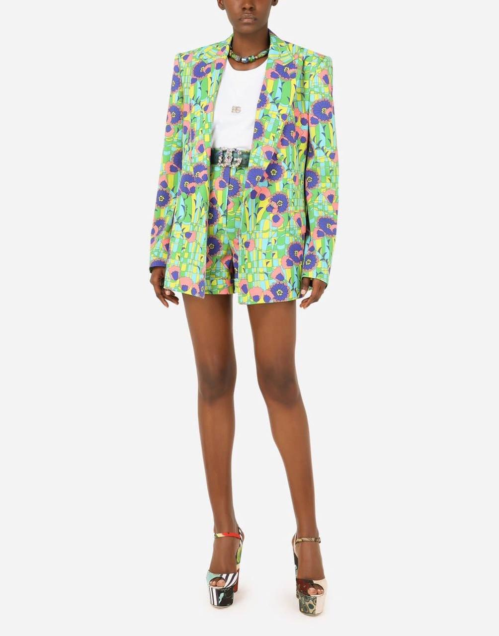 Этот яркий костюм Dolce & Gabbana LUX-68929, состоящий из жакета и шорт, демонстрирует смелый цветочный принт с преобладанием зеленого, синего и розового оттенков. Жакет имеет классический крой с лацканами, а шорты выполнены в стиле высокой талии, создавая элегантный и современный силуэт. Такой комплект идеально подходит для создания эффектных летних образов, подчеркивая индивидуальность и чувство стиля.
