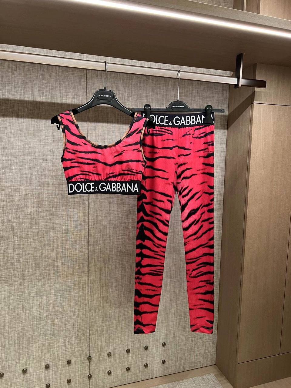 Представляем спортивный костюм Dolce & Gabbana LUX-69413, яркое сочетание стиля и комфорта. Этот двухпредметный комплект, выполненный в эффектном красно-черном тигровом принте, состоит из топа-бра и леггинсов, каждый из которых украшен узнаваемым логотипом бренда. Оригинальный дизайн костюма Dolce & Gabbana LUX-69413 идеально подойдет для создания запоминающихся спортивных и повседневных образов, подчеркивая вашу индивидуальность.