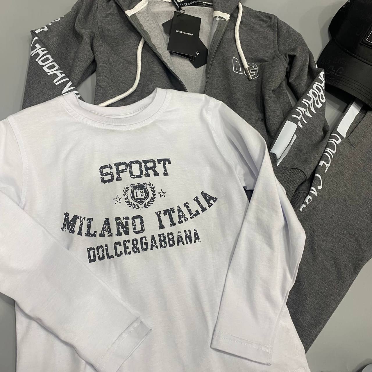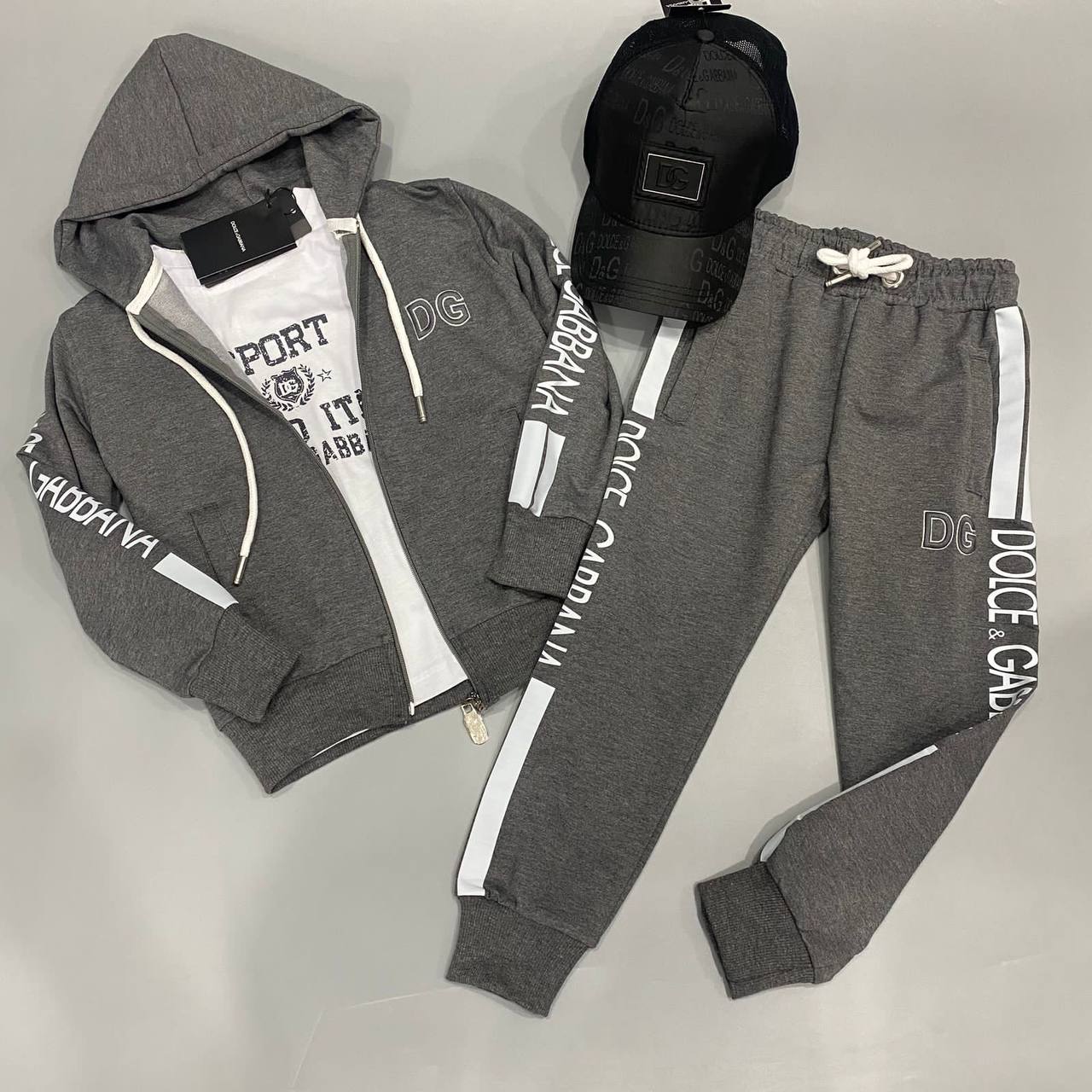 Костюм 3-ка Dolce & Gabbana LUX-92458 – это стильный спортивный костюм для повседневной носки, состоящий из трех предметов: худи, штанов и кепки. Костюм выполнен в сером цвете с белыми акцентами в виде полос и надписей. Он идеально подходит для создания комфортного и модного образа.
