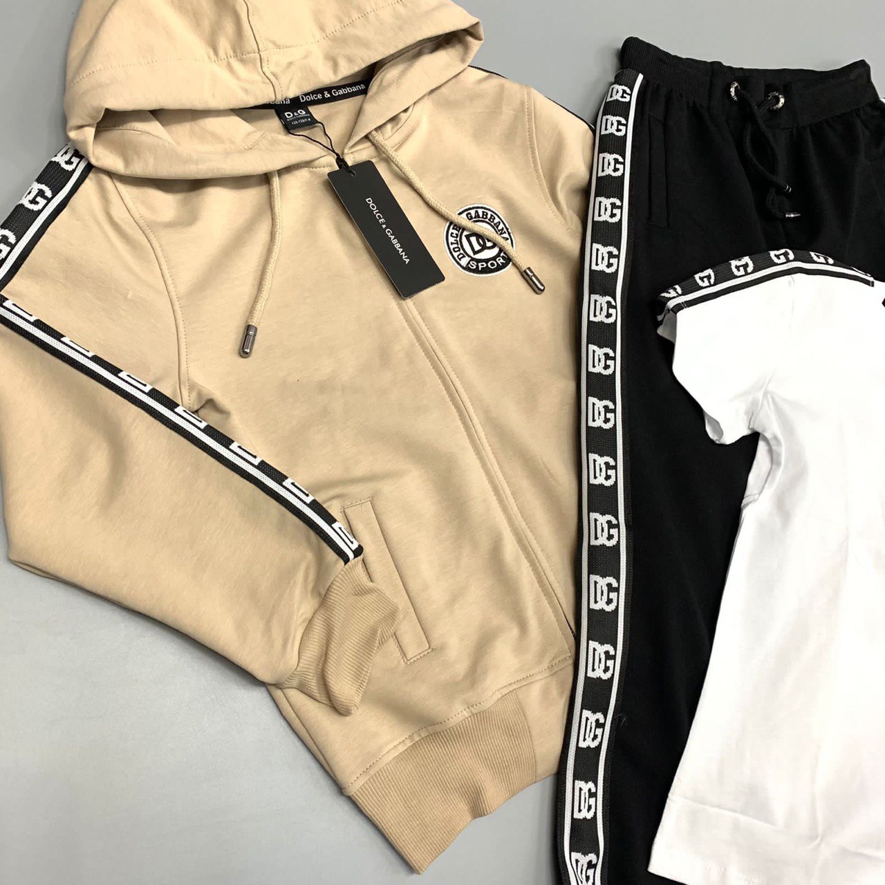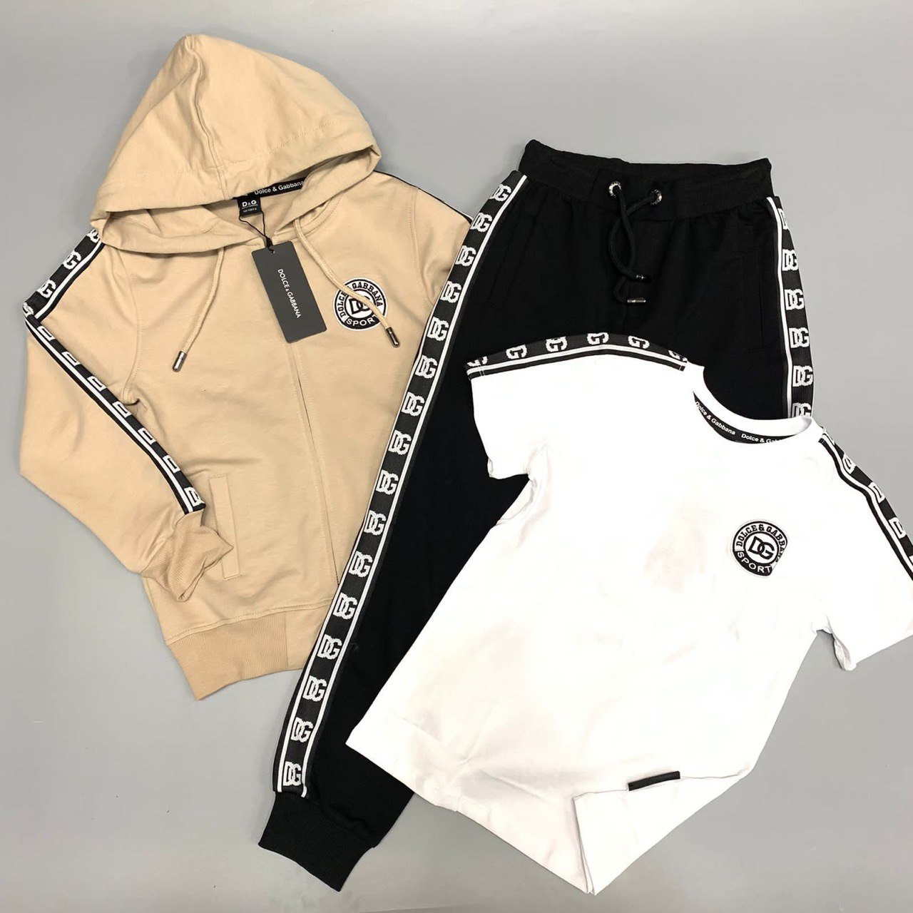 Костюм Dolce & Gabbana LUX-84162 — это спортивный костюм, сочетающий в себе фирменный стиль бренда и комфорт. Костюм представлен в трех цветах: бежевый с черными и белыми полосами на куртке, чёрные штаны и белая футболка, имеет узнаваемый дизайн, идеально подходит для создания стильного образа.