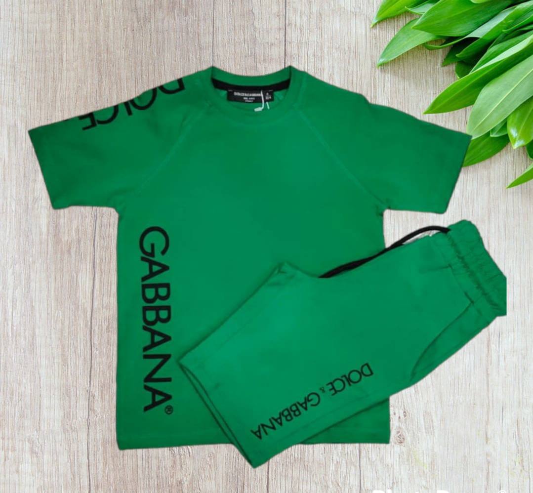 Костюм Dolce & Gabbana LUX-88707 - это стильный комплект для повседневного гардероба. Зеленый костюм, состоящий из футболки и шорт, выполнен в спортивном стиле. На футболке и шортах нанесены надписи бренда.