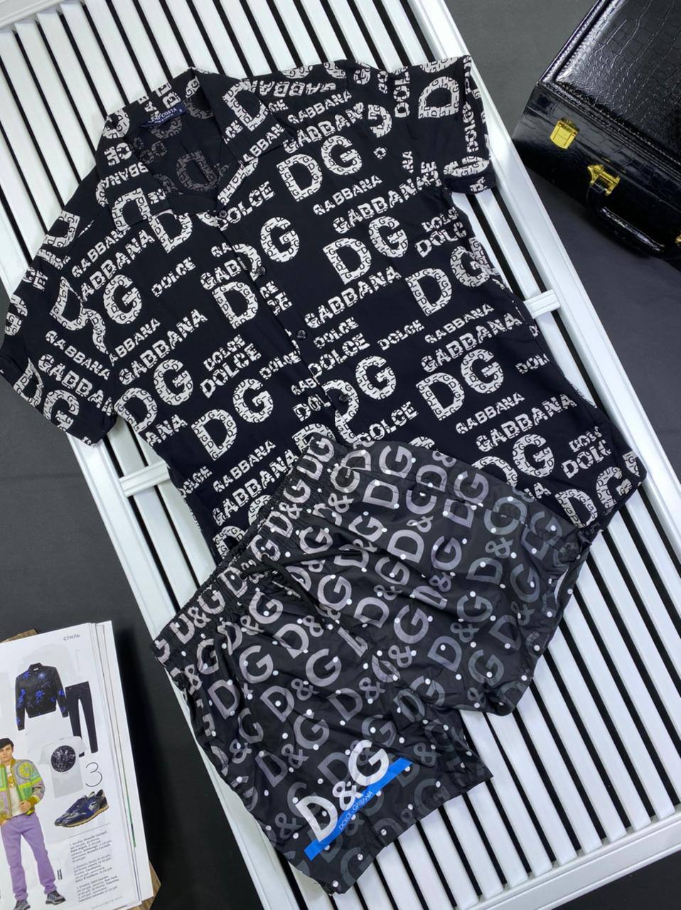 Данный костюм от Dolce & Gabbana, артикул LUX-49359, представляет собой стильный комплект, состоящий из рубашки с коротким рукавом и шорт. Оба элемента выполнены в черном цвете и украшены эффектным принтом с узнаваемым логотипом бренда "DG" и надписями "DOLCE GABBANA". Дизайн костюма подчеркивает изысканный вкус и любовь к роскоши, присущие этому итальянскому дому моды.