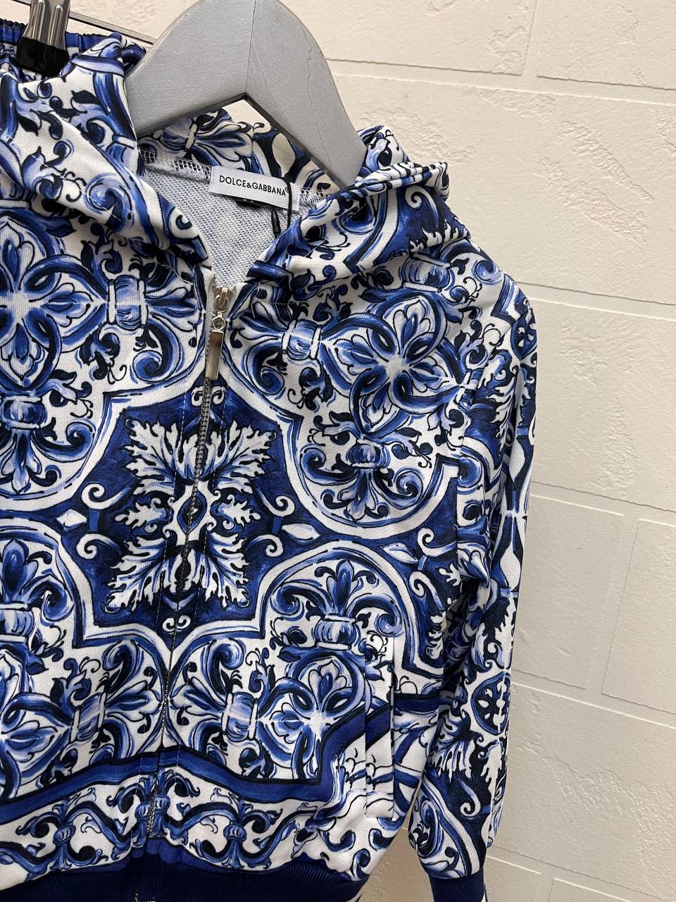 Костюм спортивный Dolce & Gabbana LUX-110185 представляет собой стильный спортивный костюм, выполненный в оригинальном дизайне. Костюм состоит из худи с молнией и спортивных брюк, украшенных сложным узором в сине-белых тонах. Такой костюм подойдет для создания эффектных образов в повседневной жизни.
