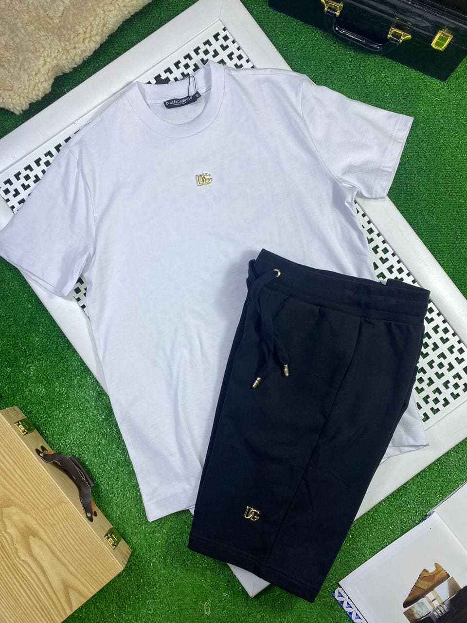 Этот спортивный костюм Dolce & Gabbana LUX-63658 представляет собой стильный и удобный комплект, состоящий из белой футболки и черных шорт. Дизайн костюма отличается лаконичностью и элегантностью, подчеркнутой золотистыми логотипами бренда. Комплект идеально подходит для создания расслабленных, но в то же время трендовых образов.