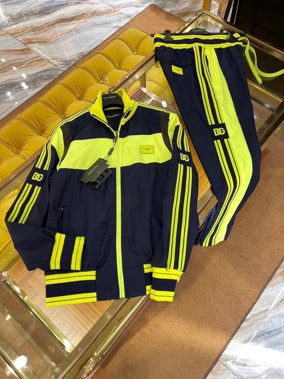 Костюм спортивный Dolce & Gabbana LUX-76752 — это стильный спортивный костюм в современном стиле. Комплект выполнен в сочетании темно-синего и неоново-желтого цветов, с контрастными полосами и фирменными логотипами. Этот костюм подойдет для занятий спортом, активного отдыха или для создания ярких повседневных образов.