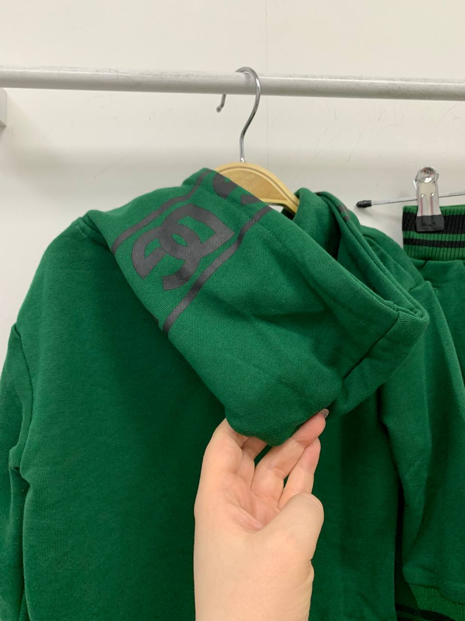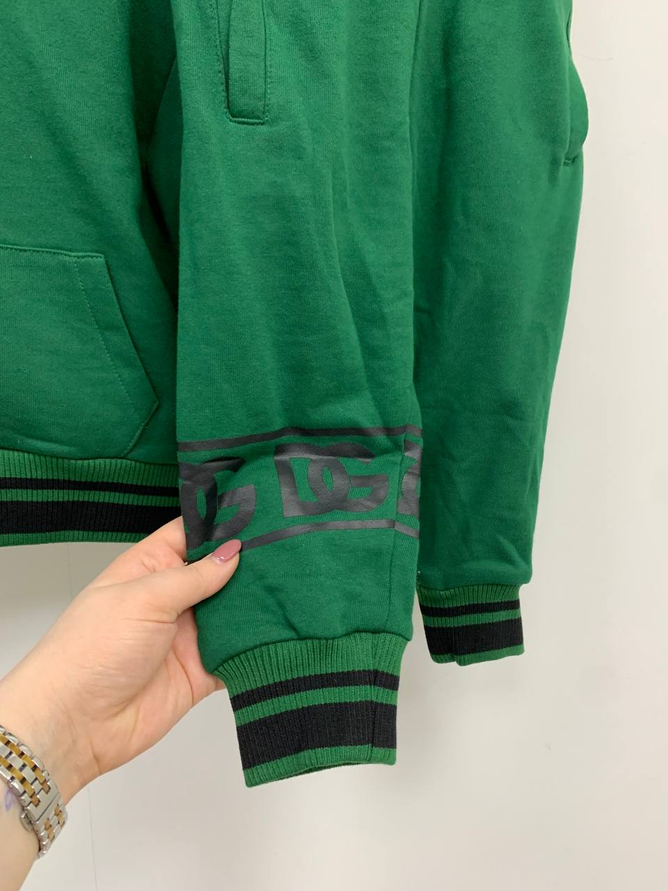 Костюм спортивный Dolce & Gabbana LUX-86127 — это комплект, выполненный в спортивном стиле. Он состоит из худи и штанов, выполненных в темно-зеленом цвете. Худи имеет капюшон и карман-кенгуру, а штаны - эластичный пояс и манжеты.