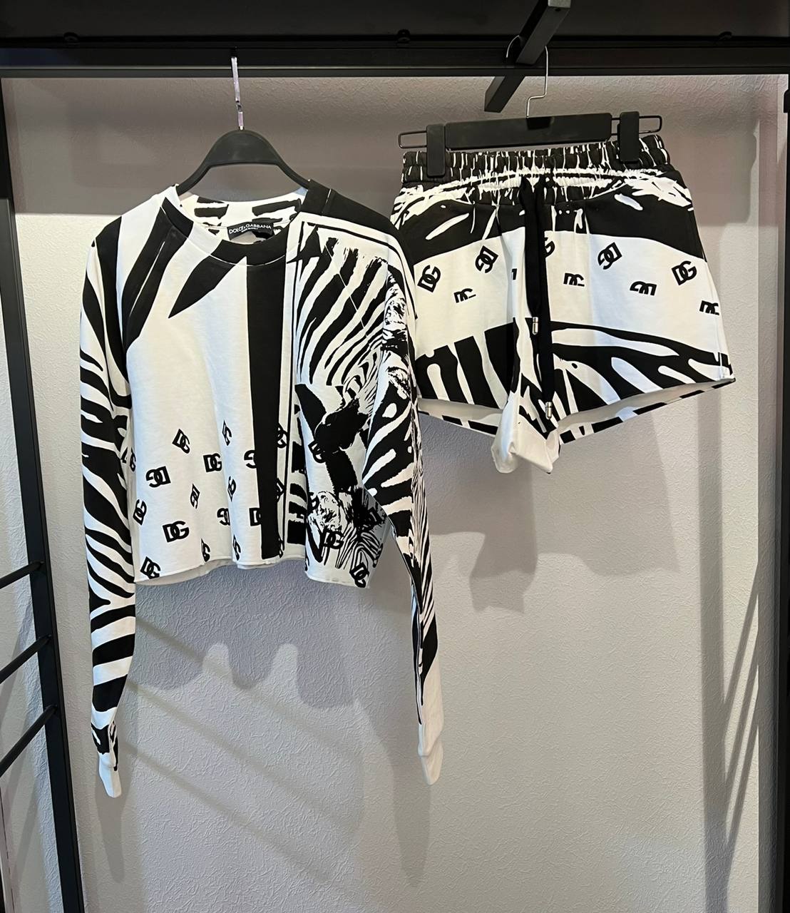 Костюм женский Dolce & Gabbana LUX-81866 представляет собой стильный и современный комплект, выполненный в черно-белой гамме. Комплект состоит из лонгслива с длинными рукавами и шорт, украшенных принтом "зебра" и логотипами бренда. Этот костюм идеально подходит для создания ярких и запоминающихся образов.