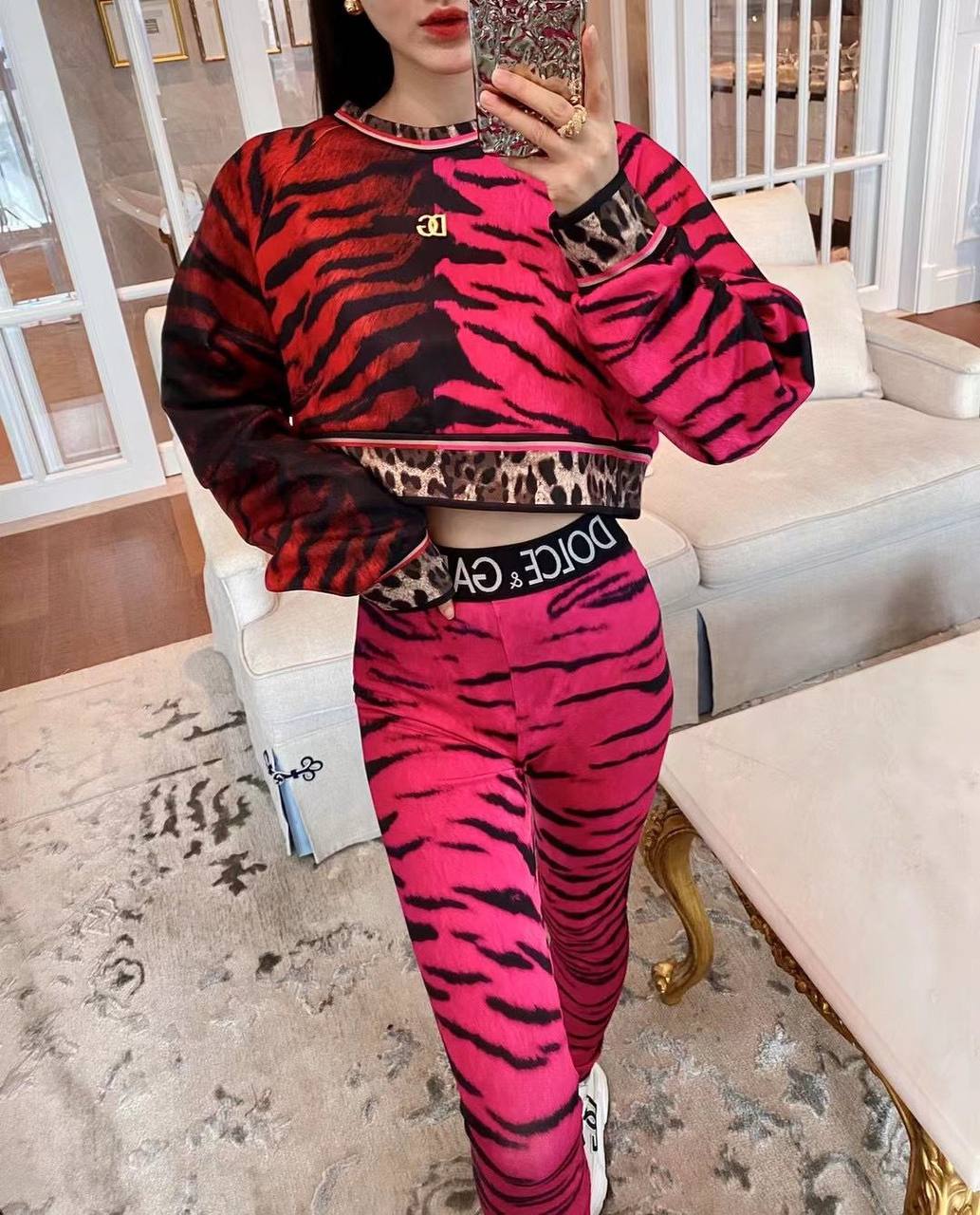 Этот костюм от Dolce & Gabbana LUX-68297 представляет собой эффектный и смелый комплект, выполненный в ярком дизайне с принтом "тигровые полосы". Комплект сочетает в себе трендовый крой и узнаваемый стиль бренда, идеально подходящий для создания запоминающихся образов.