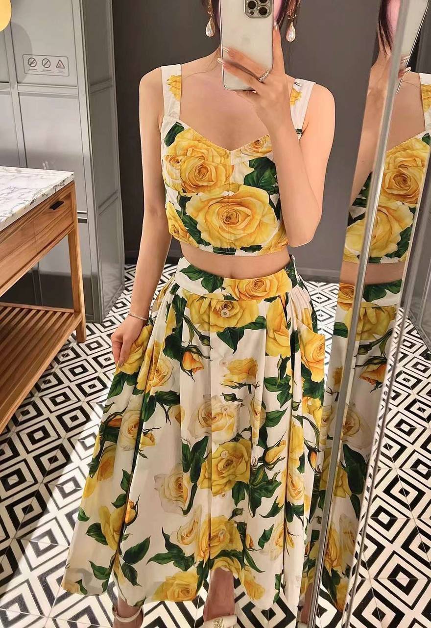 Костюм женский Dolce & Gabbana LUX-106050 представляет собой летний комплект, который состоит из топа и юбки. Яркий цветочный принт, доминируют желтые розы на белом фоне, создает праздничный и женственный образ. Этот костюм подойдет для различных мероприятий, от летних прогулок до торжественных вечеров.
