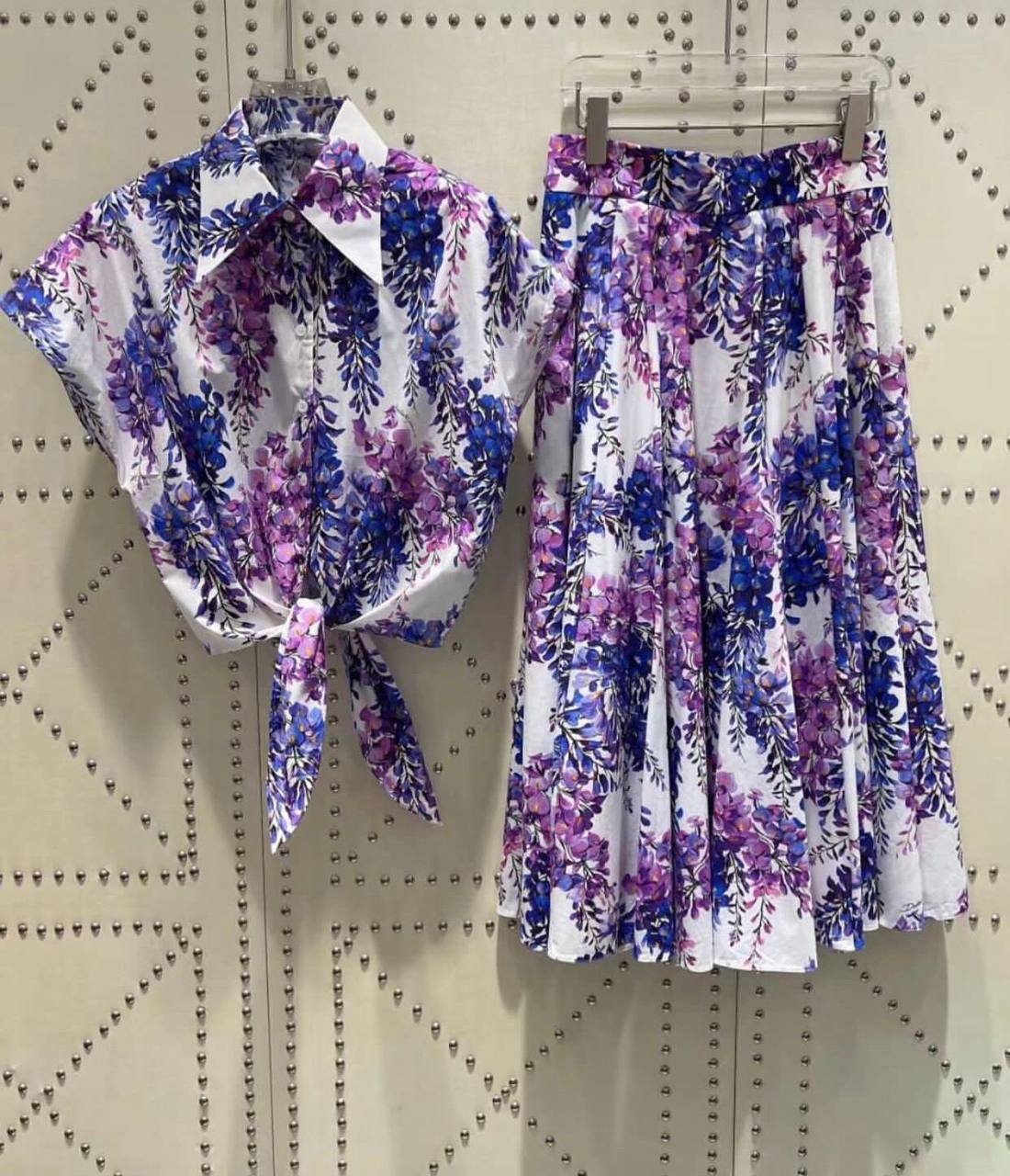 Женский костюм Dolce & Gabbana LUX-67125 — это элегантный комплект, состоящий из укороченной рубашки с коротким рукавом и расклешенной юбки миди. Оба изделия украшены ярким цветочным принтом с изображением сирени в оттенках фиолетового и синего на белом фоне. Рубашка имеет отложной воротник и завязывается на узел спереди, создавая модный и женственный силуэт. Юбка отличается высокой посадкой и плиссированной фактурой, что придает ей легкость и объем. Этот костюм идеально подходит для создания изысканных образов в теплое время года.