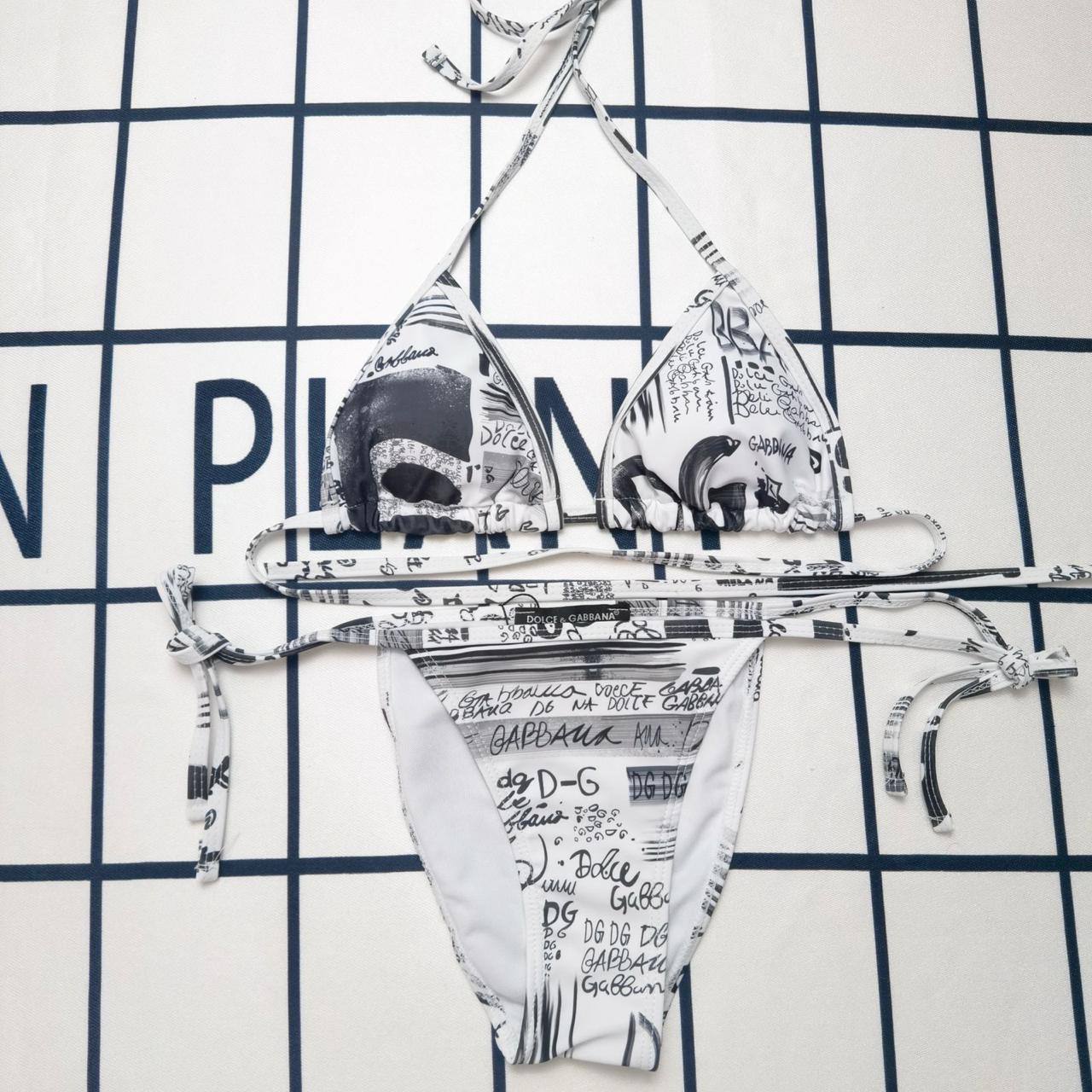 Купальник Dolce & Gabbana LUX-70232 - это стильный женский купальник, выполненный в черно-белой гамме. Он имеет классический дизайн бикини с лифом-треугольником и плавками на завязках. Купальник украшен графичным принтом с надписями и логотипами бренда.