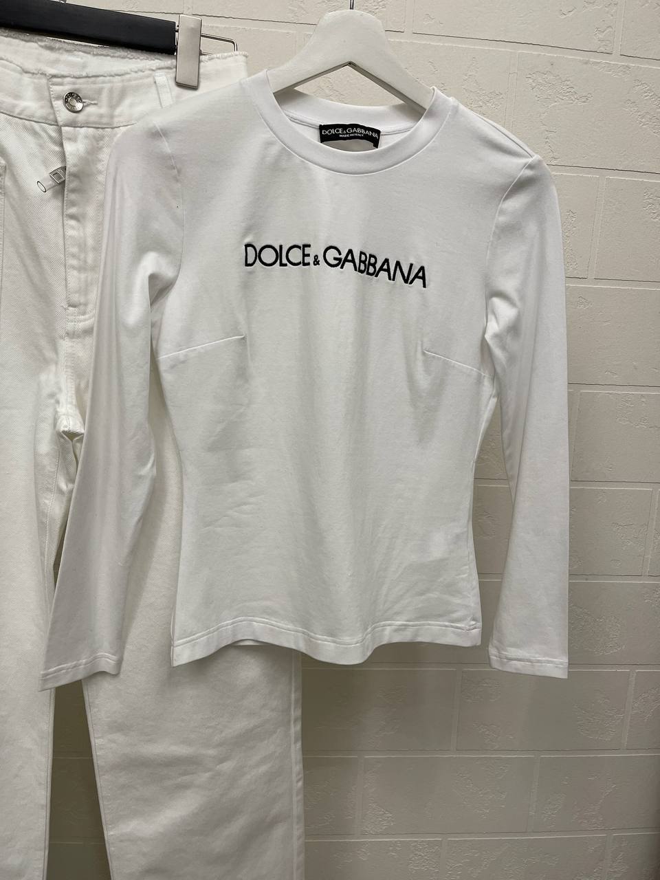 Лонгслив Dolce & Gabbana LUX-114648 - это стильный предмет гардероба от известного бренда. Модель выполнена в белом цвете, с длинными рукавами и круглым вырезом горловины. На груди расположен логотип бренда.