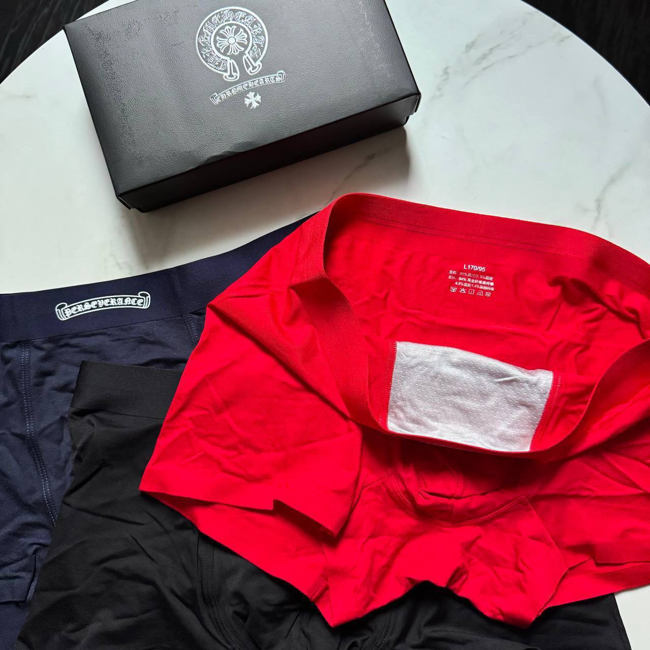 Набор из трёх боксеров CHROME HEARTS LUX-117200 — это стильный комплект мужского нижнего белья. Включает в себя три боксера разных цветов: черный, красный и темно-синий. Данный набор подчеркнет индивидуальность и предоставит комфорт на каждый день.