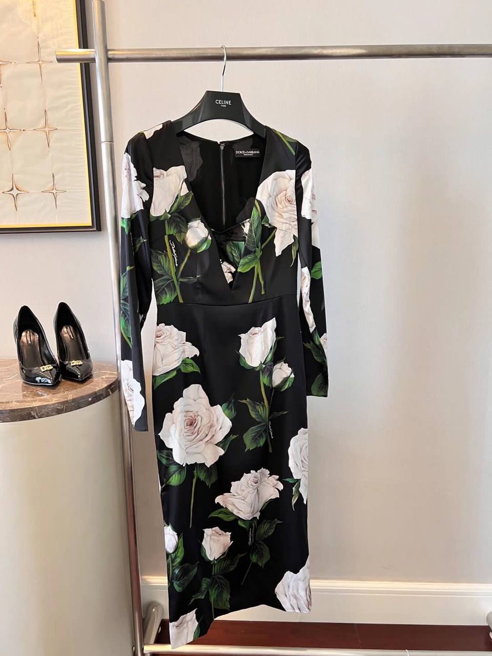 Это эффектное платье Dolce & Gabbana LUX-68146, выполненное в элегантном черном цвете, украшено изысканным принтом с белыми розами. Силуэт платья подчеркивает женственность, а глубокий V-образный вырез добавляет образу изысканности. Платье идеально подойдет для особых случаев и станет центральным элементом вечернего образа.