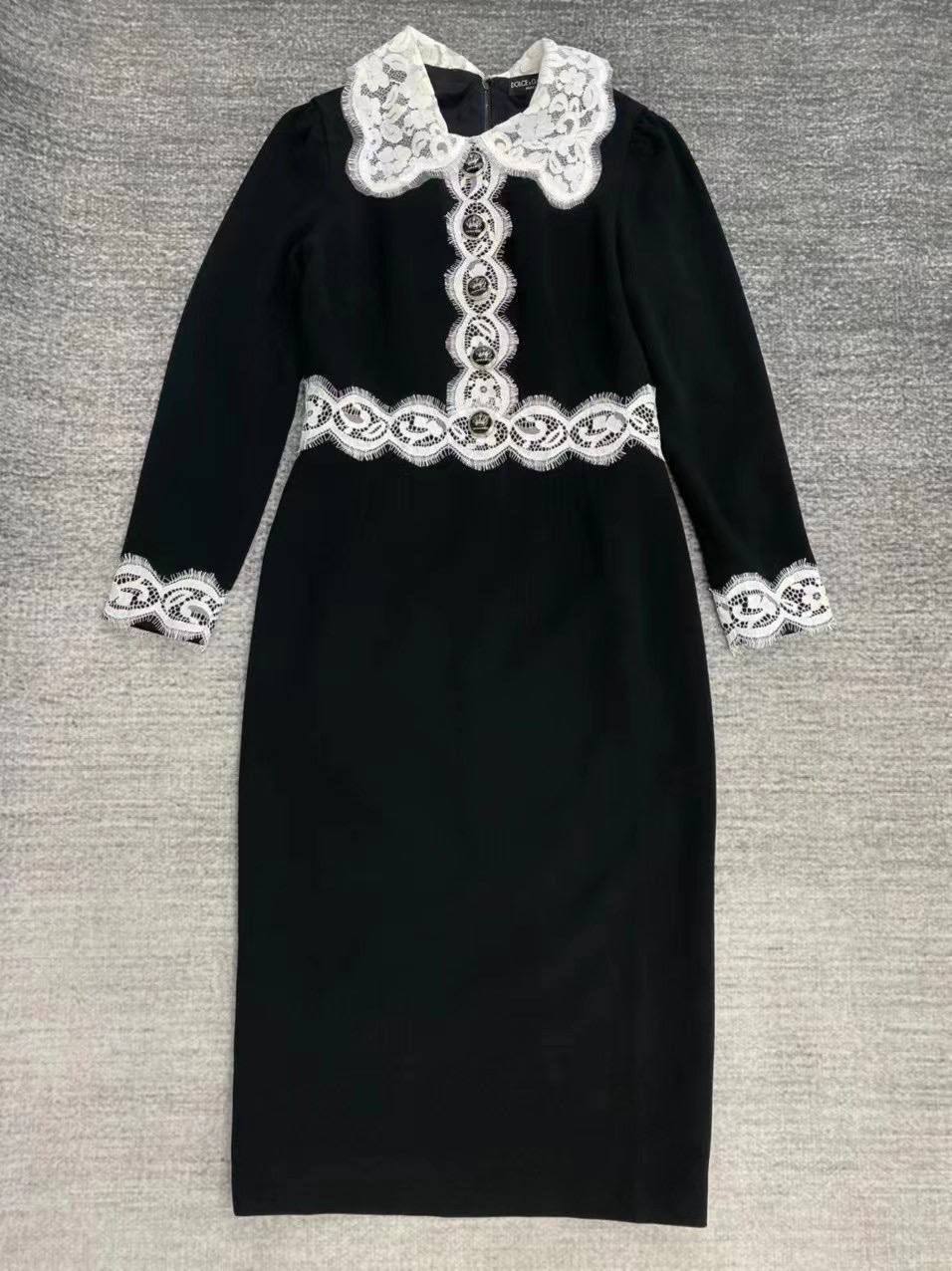 Платье Dolce & Gabbana LUX-81830 – элегантное платье миди, выполненное в классическом стиле. Основной цвет черный, контрастирующий с белыми кружевными элементами на воротнике, манжетах и талии. Отлично подойдет для создания утонченного образа.