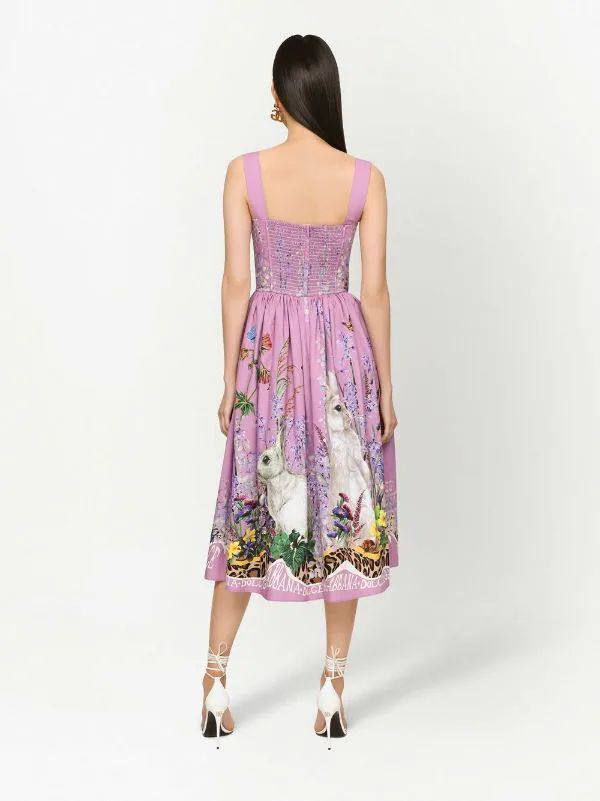 Платье Dolce & Gabbana LUX-84734 – это яркое и выразительное платье в романтическом стиле. Нежно-сиреневый цвет платья дополнен красочным принтом с изображением цветов, бабочек и кроликов. Оно привлекает внимание и идеально подходит для создания неповторимого образа.