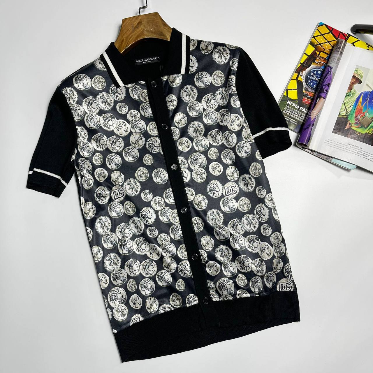 Поло Dolce & Gabbana LUX-104113 представляет собой стильное сочетание элегантности и оригинального дизайна. Поло выполнено в классическом стиле с необычным принтом в виде монет. Черный цвет поло делает его универсальным для различных образов.
