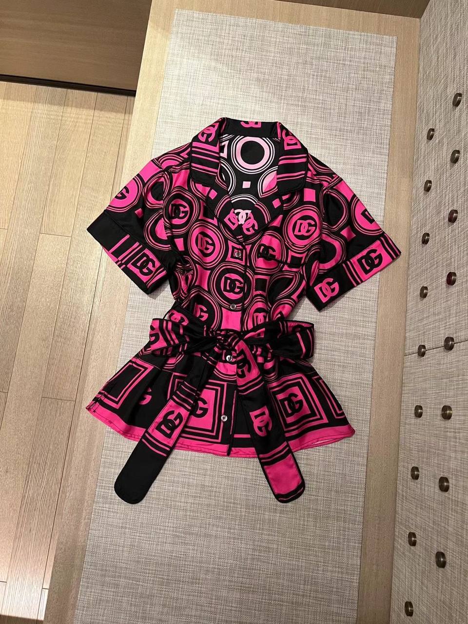 Эта рубашка Dolce & Gabbana LUX-67515 выполнена в ярком и смелом дизайне, сочетающем черный и ярко-розовый цвета. Модель украшена узнаваемым логотипом бренда, образующим повторяющийся узор. Рубашка имеет короткий рукав, отложной воротник и поставляется с поясом, позволяющим подчеркнуть талию.