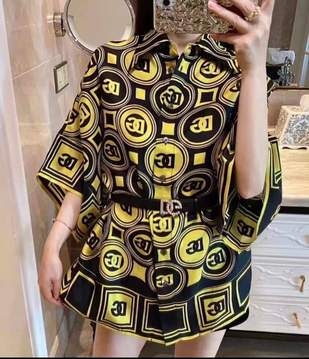 Рубашка Dolce & Gabbana LUX-68542 представляет собой яркое и стильное решение для женского гардероба. Ее отличительной чертой является оригинальный принт с элементами логотипа бренда, выполненный в контрастной черно-желтой гамме. Свободный крой и короткие рукава обеспечивают комфорт, а наличие пояса позволяет подчеркнуть талию. Эта модель идеально подходит для создания эффектных повседневных и вечерних образов.