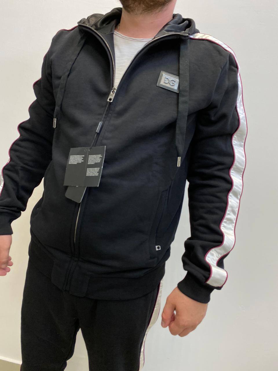 Sale! Спортивный костюм Dolce & Gabbana LUX-86295 - это элегантный спортивный костюм в классическом стиле. Комплект выполнен в черном цвете с контрастными серебристыми полосами и красными вставками, придающими ему современный вид. Идеально подходит для повседневной носки, занятий спортом и создания стильных образов.