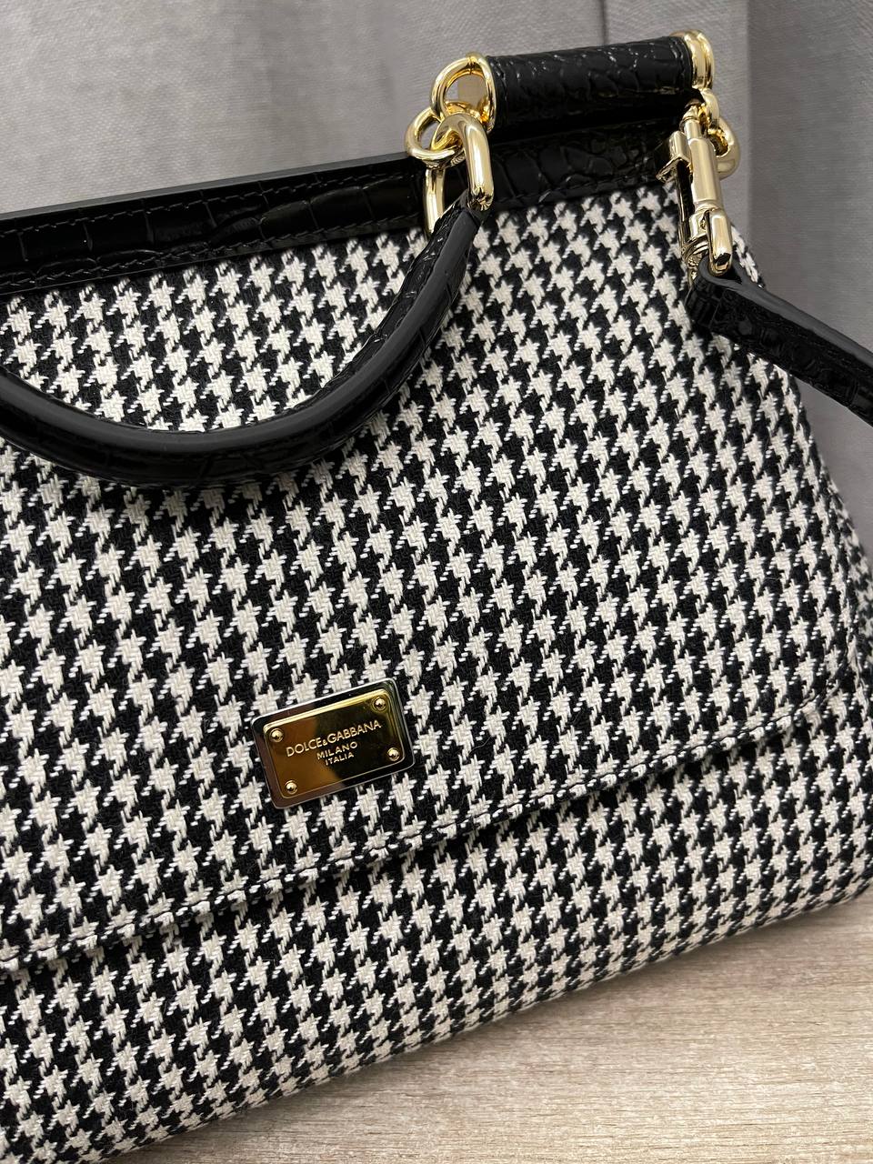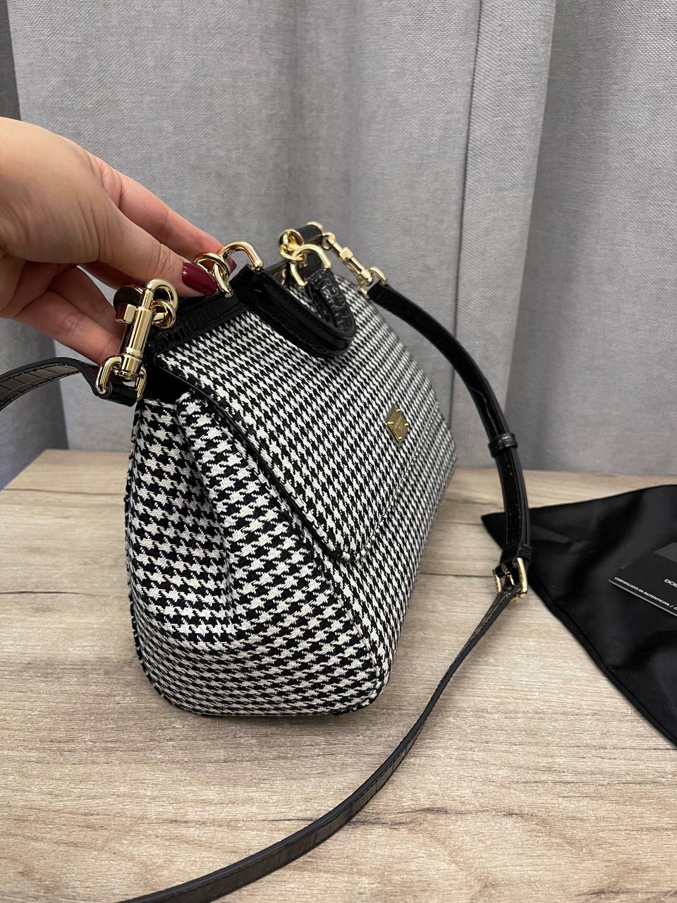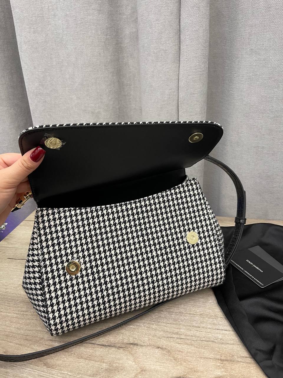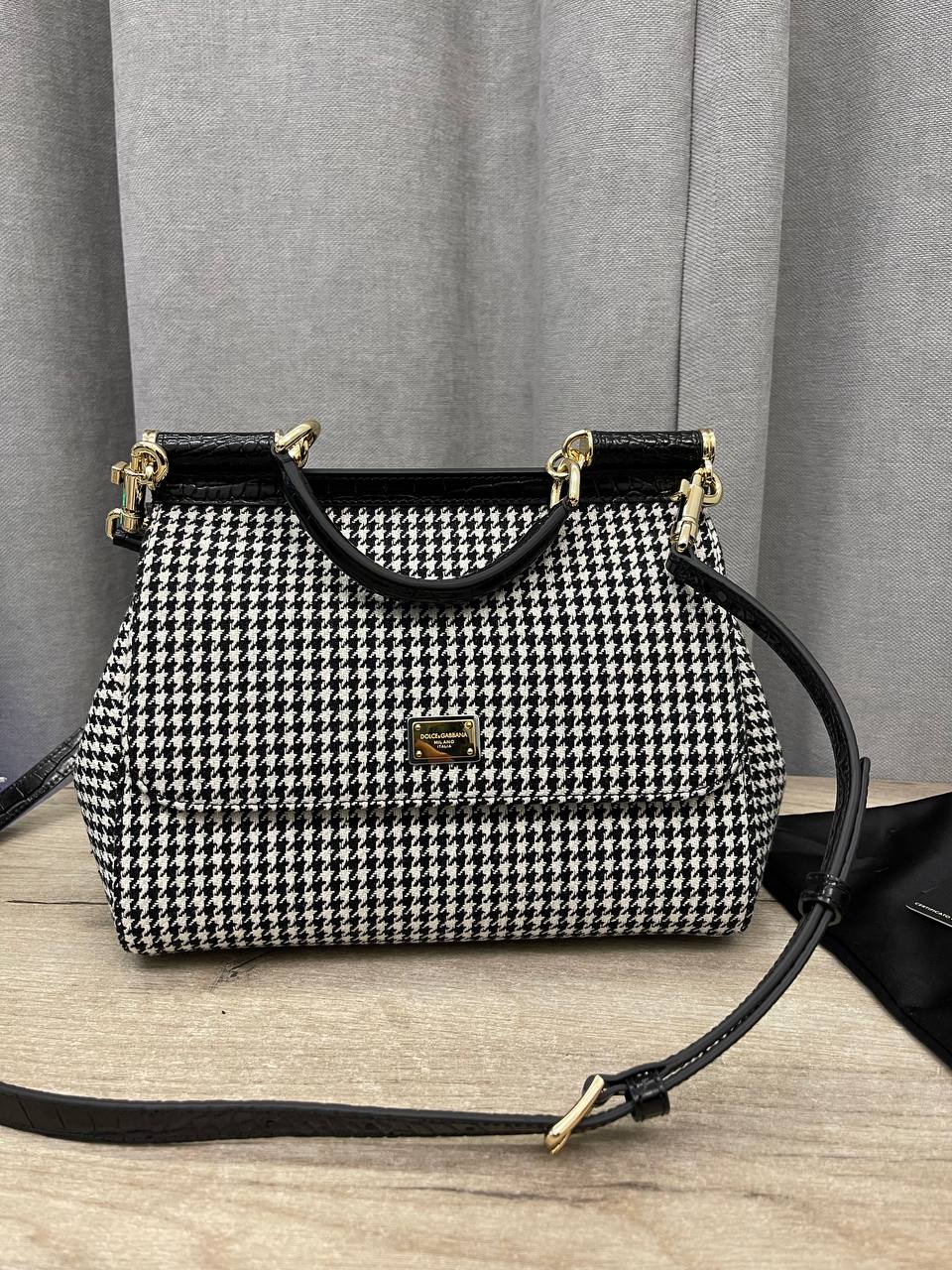 Сумка женская Dolce & Gabbana LUX-114251 – это элегантный аксессуар в классическом стиле, который станет прекрасным дополнением к вашему образу. Сумка выполнена в черно-белой гамме с узором "гусиная лапка", что придает ей изысканный вид. Она подходит для повседневного использования, а также для особых случаев.