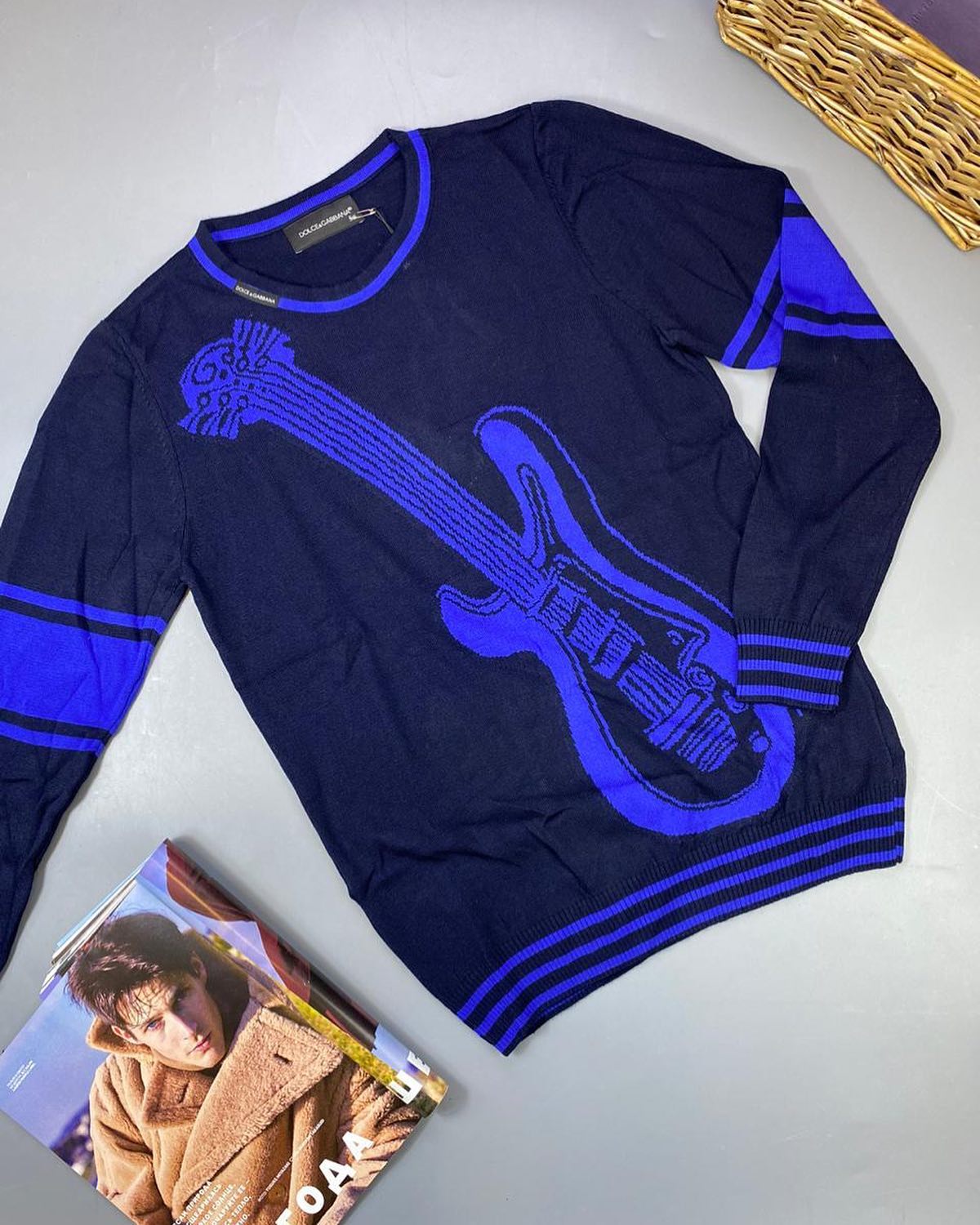 Свитер мужской Dolce & Gabbana LUX-37057 — это стильный и яркий предмет гардероба, выполненный в темно-синем цвете с контрастным синим изображением электрогитары на груди. Модель отличается оригинальным дизайном и высоким качеством исполнения, что характерно для бренда Dolce & Gabbana. Свитер отлично подойдет для создания непринужденных повседневных образов.