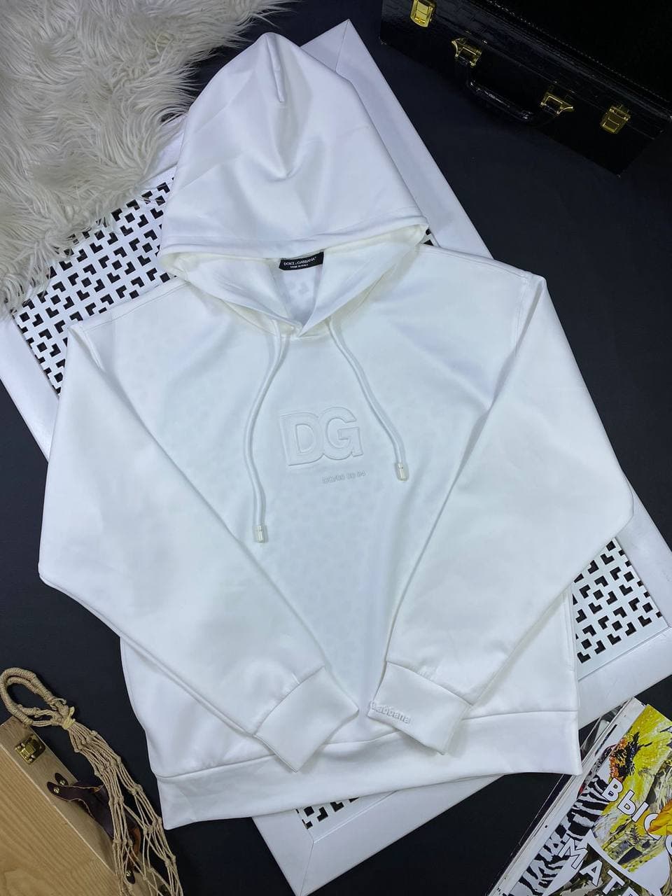 Стильная белая толстовка Dolce & Gabbana LUX-56541 с объемным тиснением логотипа "DG" на груди. Модель выполнена в классическом спортивном стиле с капюшоном и регулируемыми шнурками. Тонкий рельефный узор по всей поверхности добавляет изделию уникальности. Эта толстовка идеально подходит для создания современных повседневных образов.