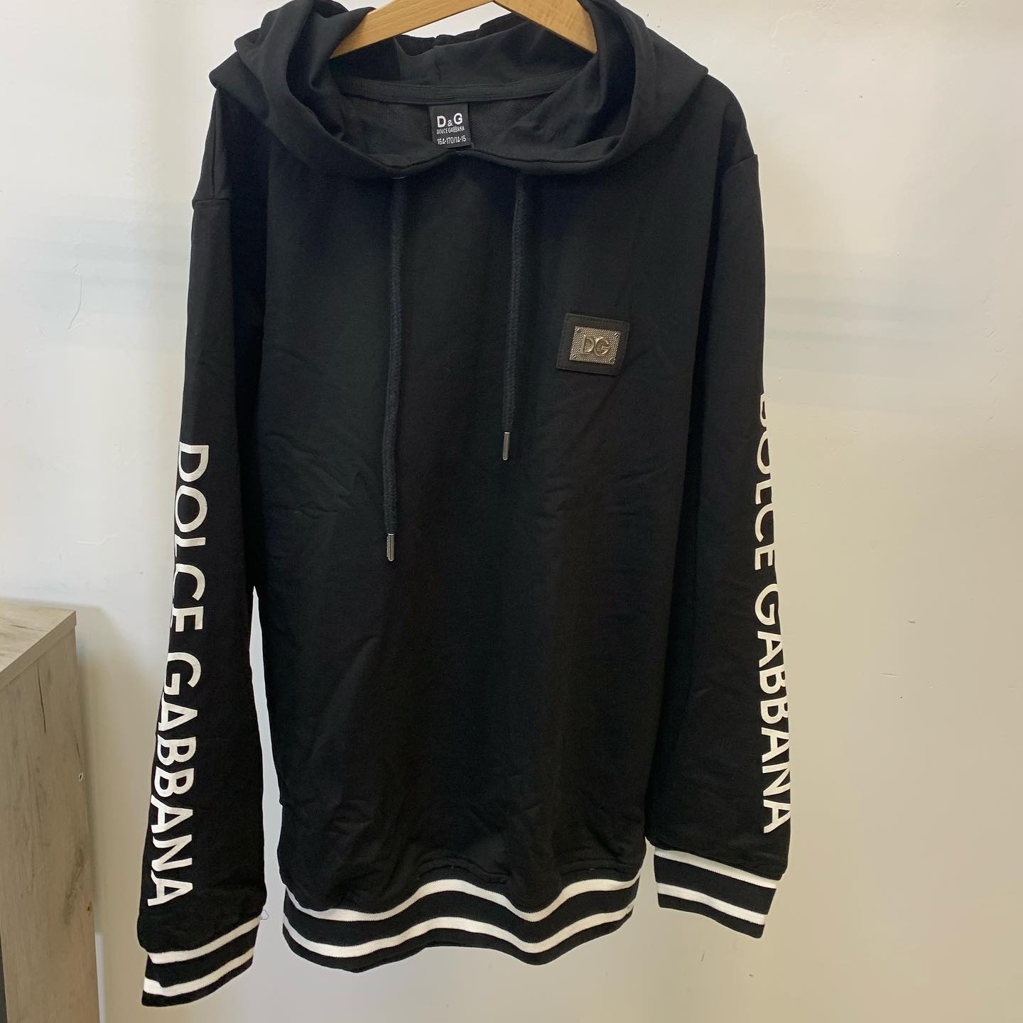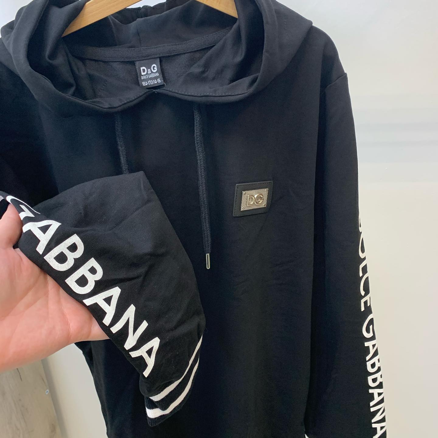 Стильная толстовка Dolce & Gabbana LUX-37451 выполнена в спортивном стиле с узнаваемыми элементами бренда. Модель черного цвета украшена контрастной надписью "Dolce Gabbana" на рукавах и фирменной нашивкой DG. Капюшон с завязками и манжеты с полосками добавляют изделию оригинальности. Эта толстовка станет отличным дополнением к повседневному гардеробу.