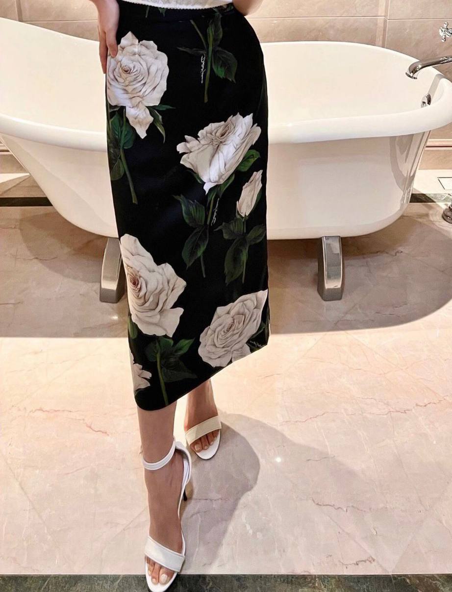 Эта юбка Dolce & Gabbana LUX-69414 представляет собой элегантное изделие с классическим черным фоном, украшенным крупными, реалистичными принтами белых роз. Модель имеет прямой крой и длину миди, что придает ей утонченный и женственный вид. Юбка идеально подойдет для создания романтичных образов, как для повседневного, так и для вечернего выхода.