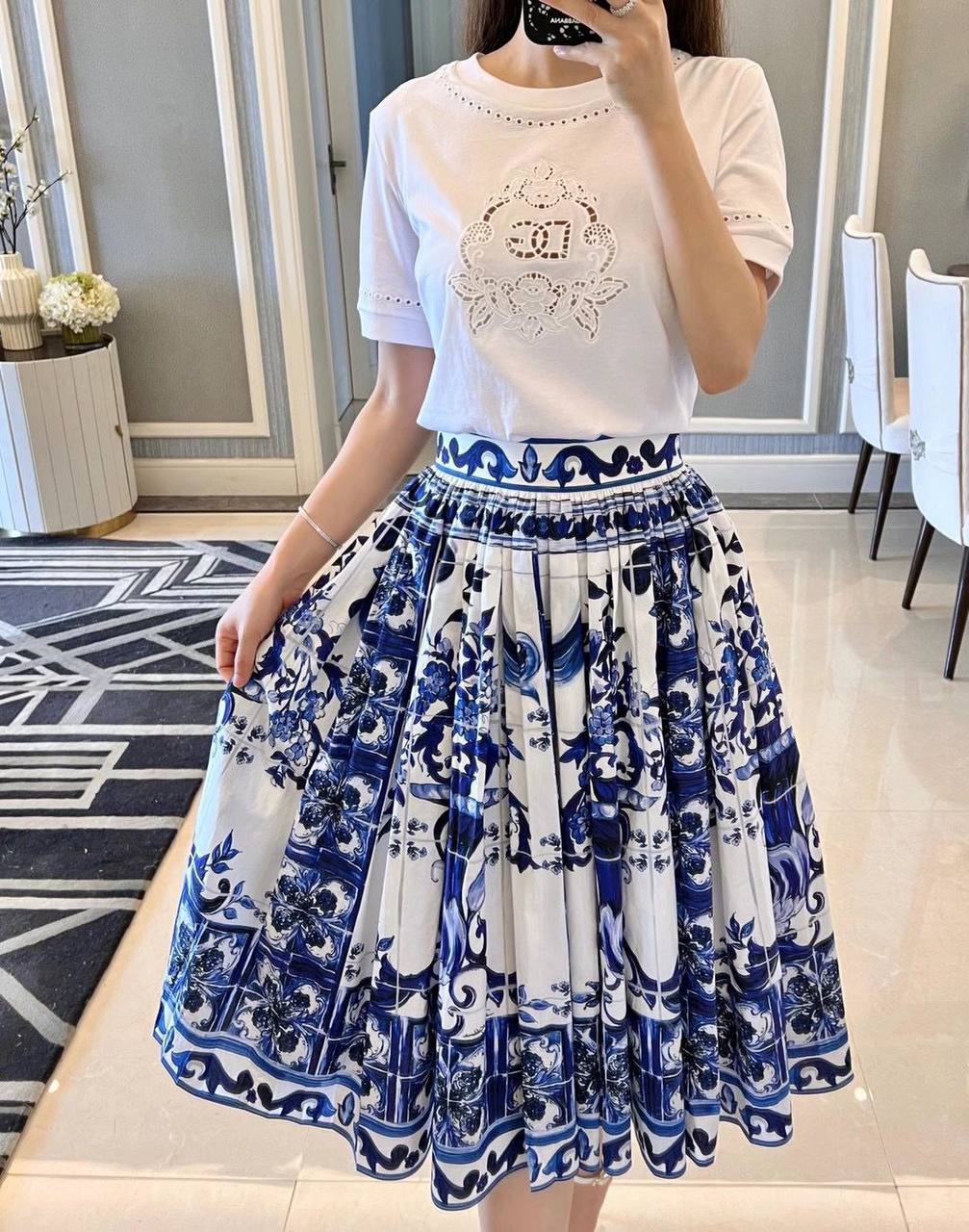 Юбка Dolce & Gabbana LUX-70600 — элегантная юбка, сочетающая в себе изысканность и оригинальность. Юбка выполнена в роскошном стиле, отличается уникальным принтом в бело-синих тонах. Идеально подходит для создания ярких и запоминающихся образов.