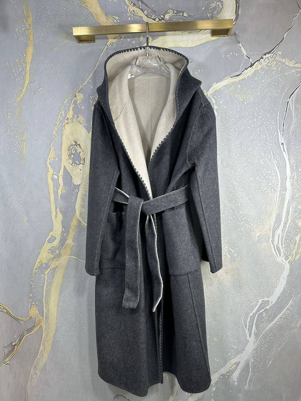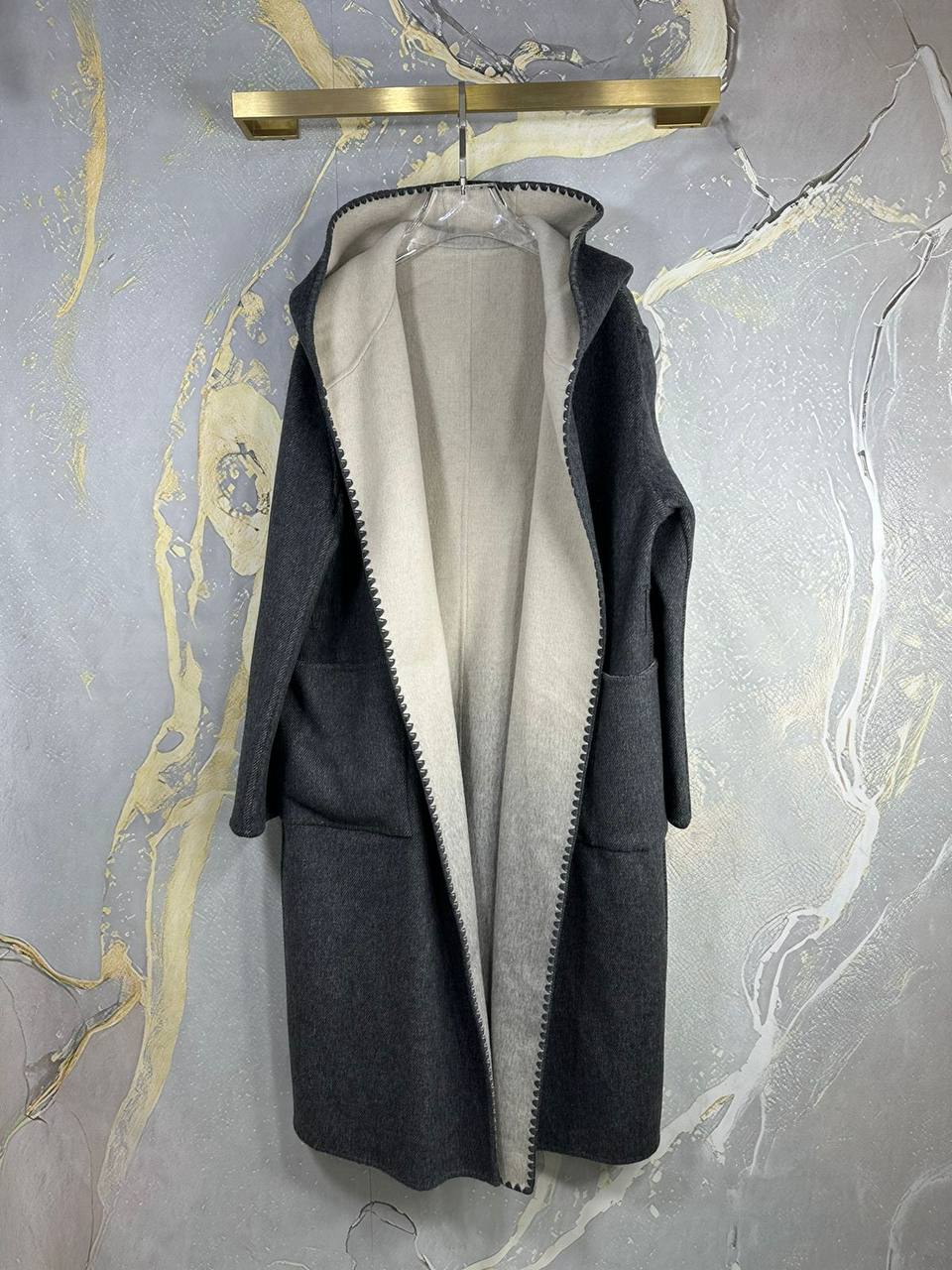 Двухстороннее пальто Toteme LUX-112028 - это воплощение стиля и элегантности. Пальто выполнено в сочетании серых оттенков, создавая мягкий градиентный переход от светлого к темному. Двусторонний дизайн, капюшон и пояс делают его идеальным для создания уютного и стильного образа.