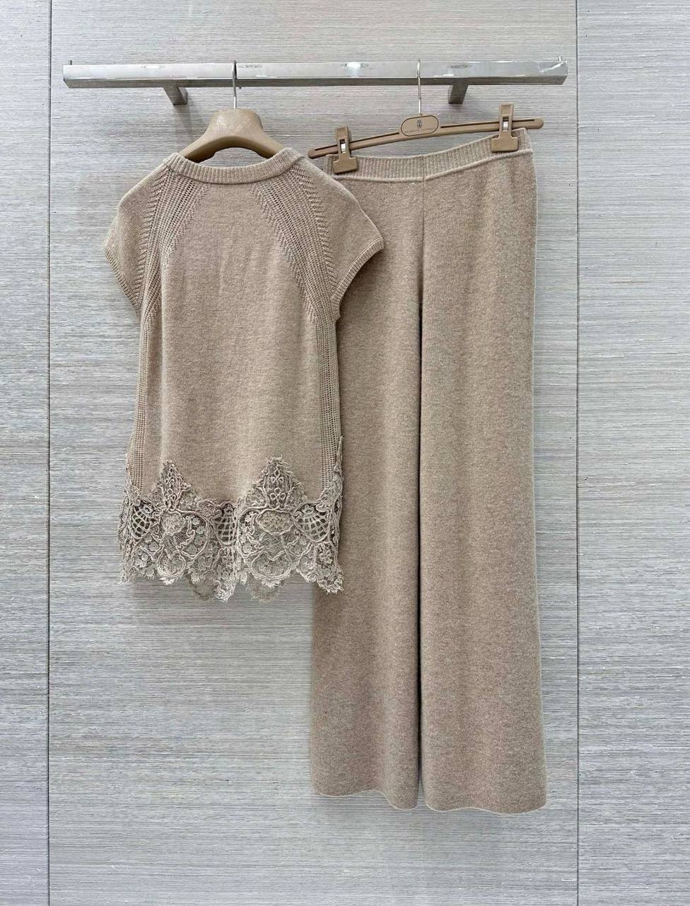 Элегантный женский костюм от Ermanno Scervino - это сочетание комфорта и изысканного стиля. Комплект состоит из топа с кружевной отделкой и брюк, выполненных в едином нежном оттенке. Отличный выбор для создания утонченного образа.