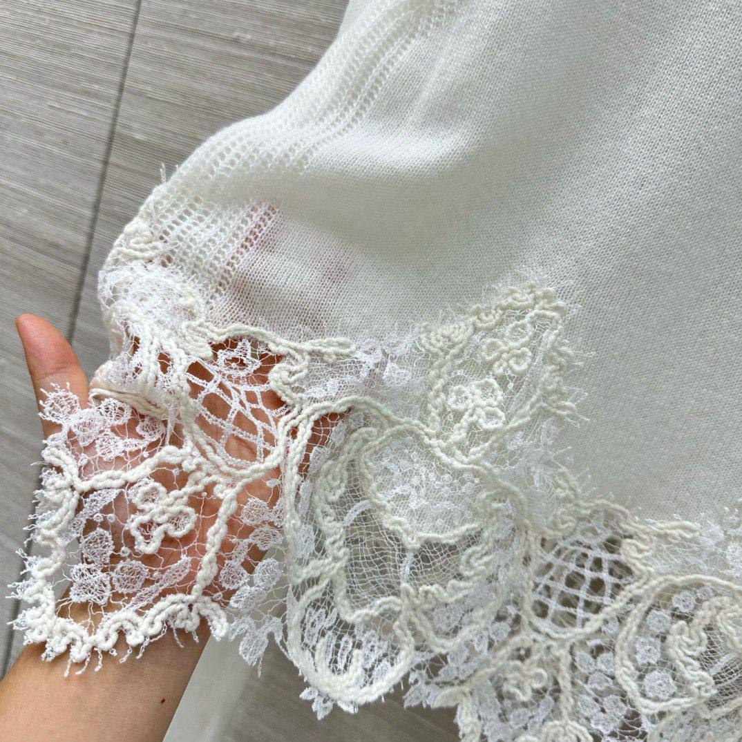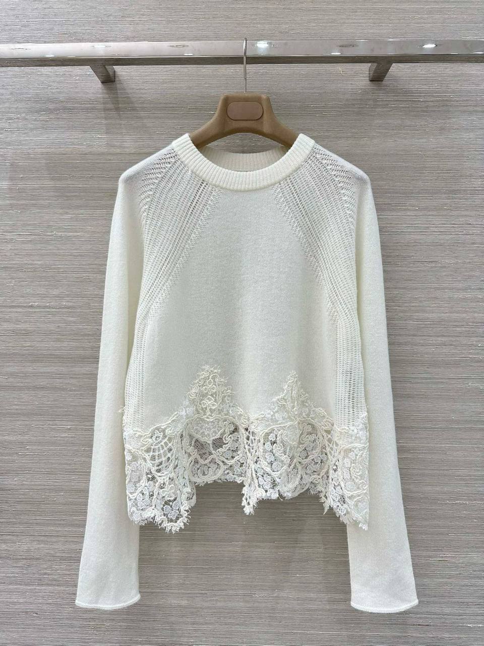 Представленный женский костюм от Ermanno Scervino излучает элегантность и современный стиль. Он состоит из джемпера с кружевной отделкой и широких брюк, создавая изысканный и утонченный образ.