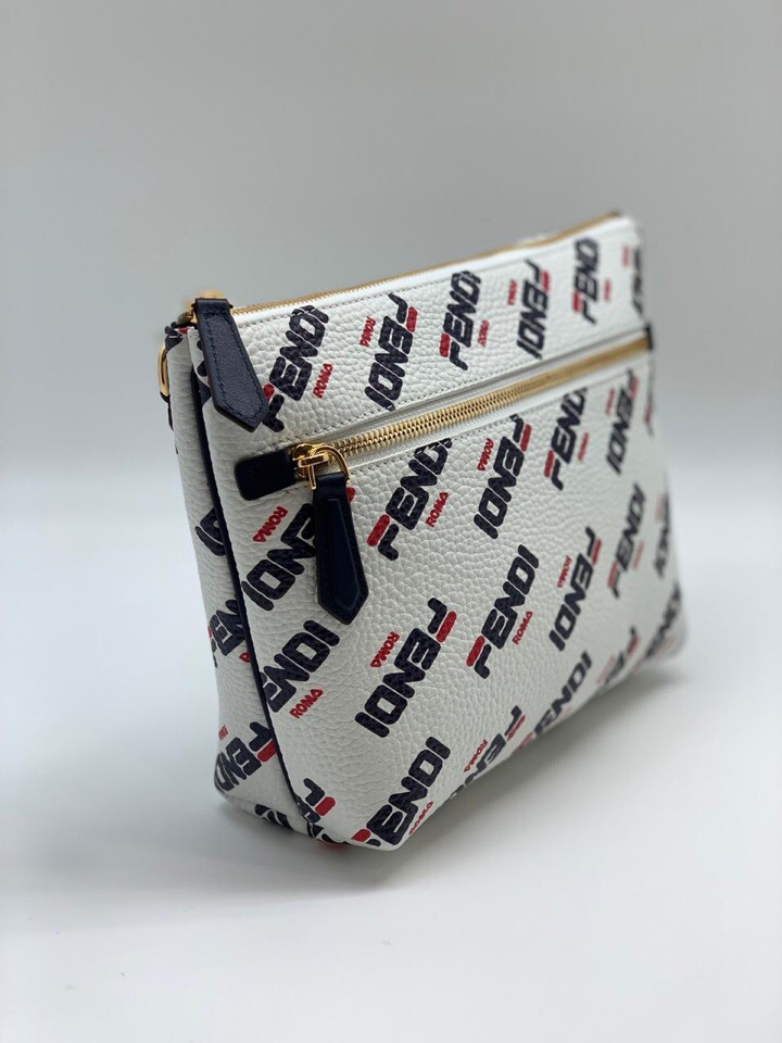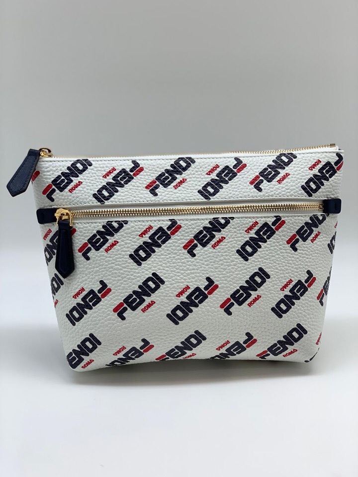 Клатч Fendi СЖ-556 представляет собой стильный аксессуар для женщин, выполненный в характерном для бренда дизайне. Аксессуар декорирован повторяющимся монограммным принтом Fendi Roma в сочетании темно-синего и красного цветов на белом фоне, что придает ему узнаваемый и элегантный вид. Застежка-молния и прочная конструкция делают его практичным выбором для хранения косметики или других мелочей.