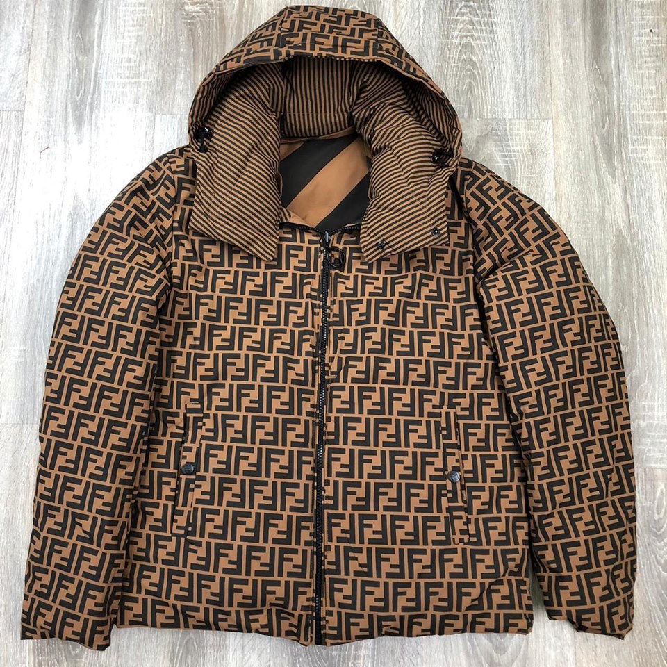 Этот двусторонний пуховик Fendi LUX-20749 представляет собой стильное и практичное решение для современного гардероба. Пуховик выполнен в коричневом цвете с характерным принтом FF, который мгновенно узнаваем и придает изделию узнаваемость бренда. Отличительной особенностью является двусторонний дизайн, позволяющий менять образ, а подкладка с принтом в полоску добавляет изысканности. Капюшон и удобная застежка-молния обеспечивают дополнительную защиту от непогоды.