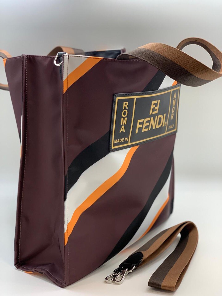 Сумка-шопер Fendi СЖ-557 представляет собой стильный аксессуар, выполненный в узнаваемом дизайне бренда Fendi. Эта сумка отличается ярким принтом в виде диагональных полос различных цветов, что придает ей динамичный и модный вид. На передней части расположена крупная нашивка с логотипом Fendi и надписями "ROMA", "AMOR", "MADE IN ITALY", подчеркивающая принадлежность к знаменитому дому моды. Модель имеет удобные ручки для ношения в руке, а также съемный регулируемый ремень для ношения через плечо.