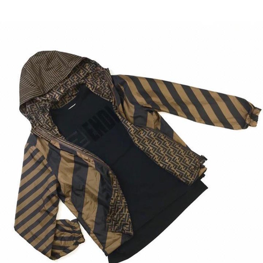 Эта двухсторонняя ветровка Fendi LUX-30676 сочетает в себе спортивный шик и узнаваемый стиль бренда. С одной стороны она украшена эффектными диагональными полосами коричневого и черного цветов, а с другой – характерным монограммным принтом FF, что делает ее по-настоящему универсальной. Модель с капюшоном идеально подойдет для переменчивой погоды, обеспечивая комфорт и защиту.