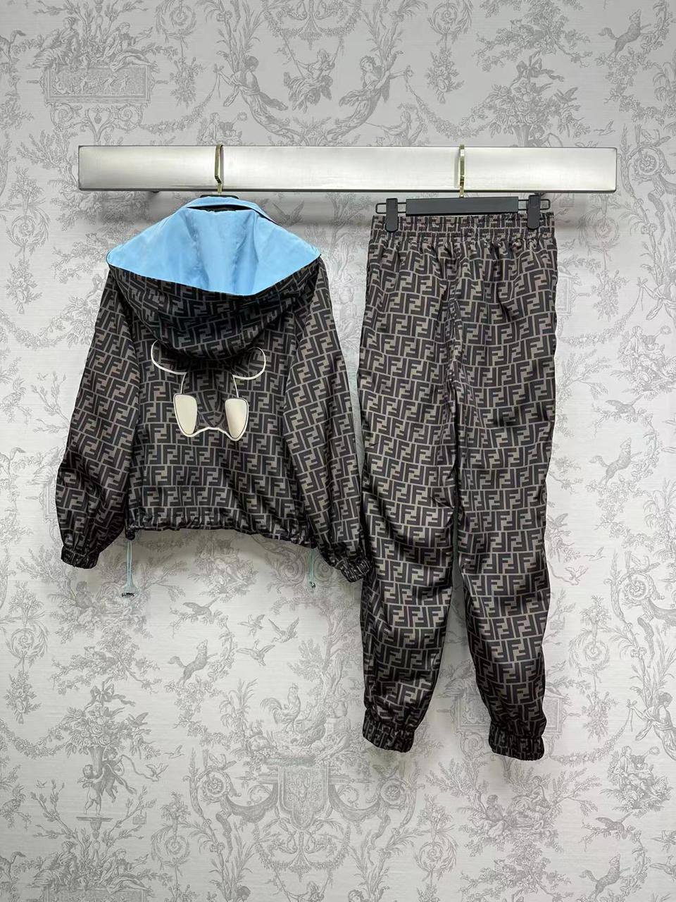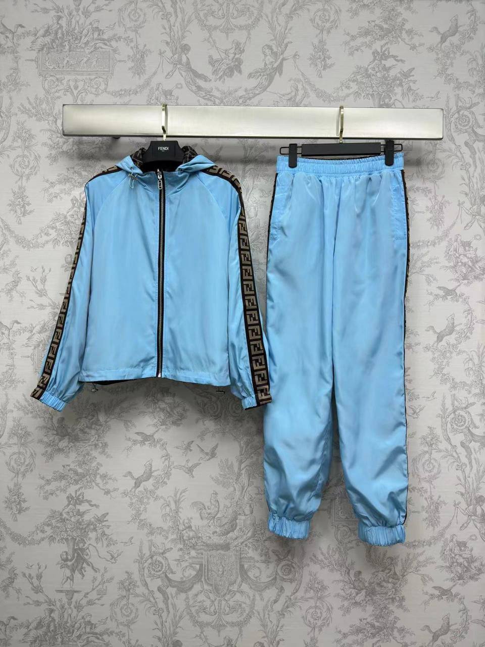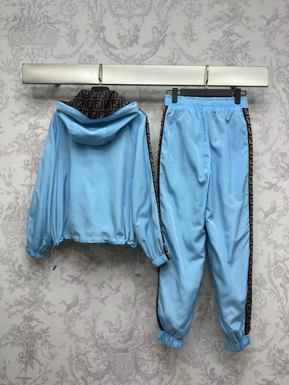 Двусторонний костюм Fendi LUX-103801 — это стильный спортивный костюм, выполненный в узнаваемом стиле бренда. Комплект состоит из куртки и брюк, выполненных в двух вариантах: с узнаваемым логотипом и в однотонном голубом цвете. Костюм подходит для повседневной носки, прогулок и активного отдыха.