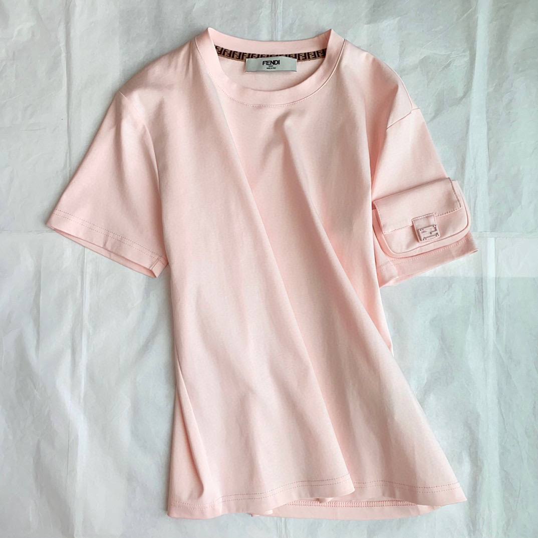 Футболка Fendi LUX-83959 выполнена в повседневном стиле, нежно-розового цвета. Она имеет круглый вырез горловины и короткие рукава, а также небольшой карман на рукаве. Эта футболка подойдет для создания как повседневных, так и более элегантных образов.