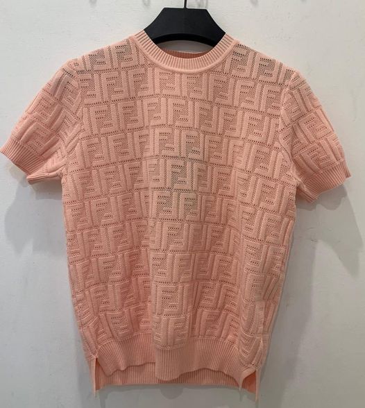 Стильная женская кофта Fendi LUX-46618 выполнена в нежном розовом цвете и украшена фирменным монограммным узором FF. Открытый трикотаж придает изделию легкость и воздушность, делая его идеальным выбором для теплого времени года. Кофта имеет короткие рукава и круглый вырез горловины, а также небольшие разрезы по бокам для дополнительного комфорта и свободы движений.
