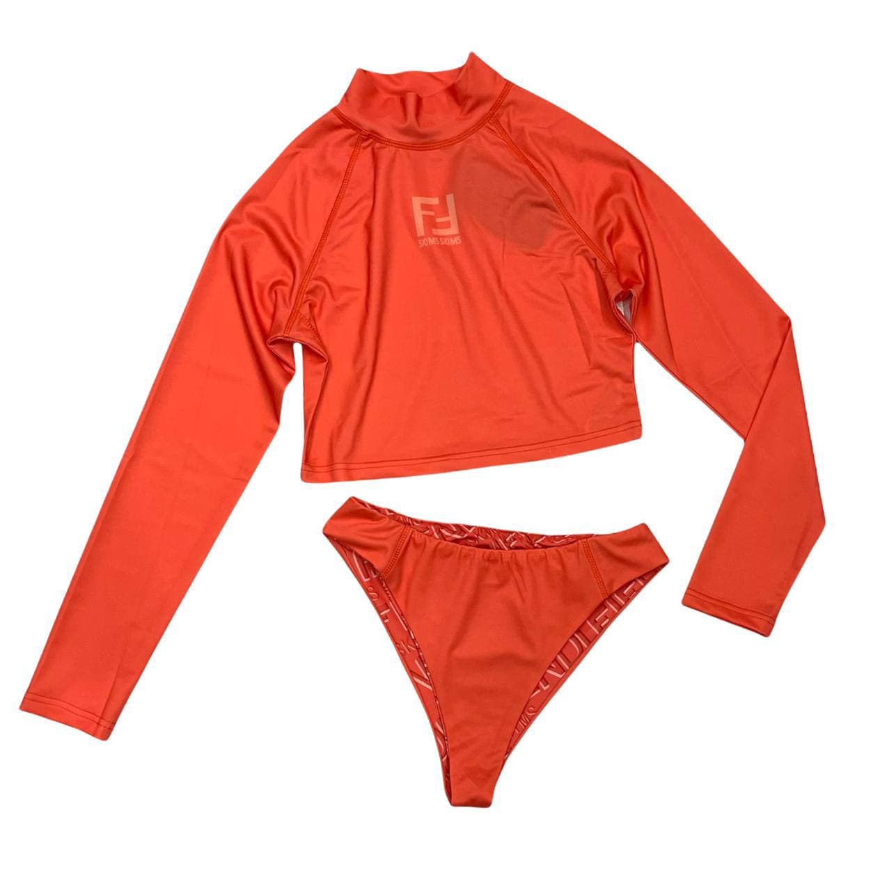 Комплект Fendi LUX-61381 представляет собой стильный и современный купальный костюм, выполненный в ярком оранжевом цвете. Этот комплект, состоящий из лонгслива с коротким подолом и плавок, идеально подойдет для активного отдыха на пляже или у бассейна. Дизайн отличается минимализмом и элегантностью, подчеркнутыми логотипом бренда.
