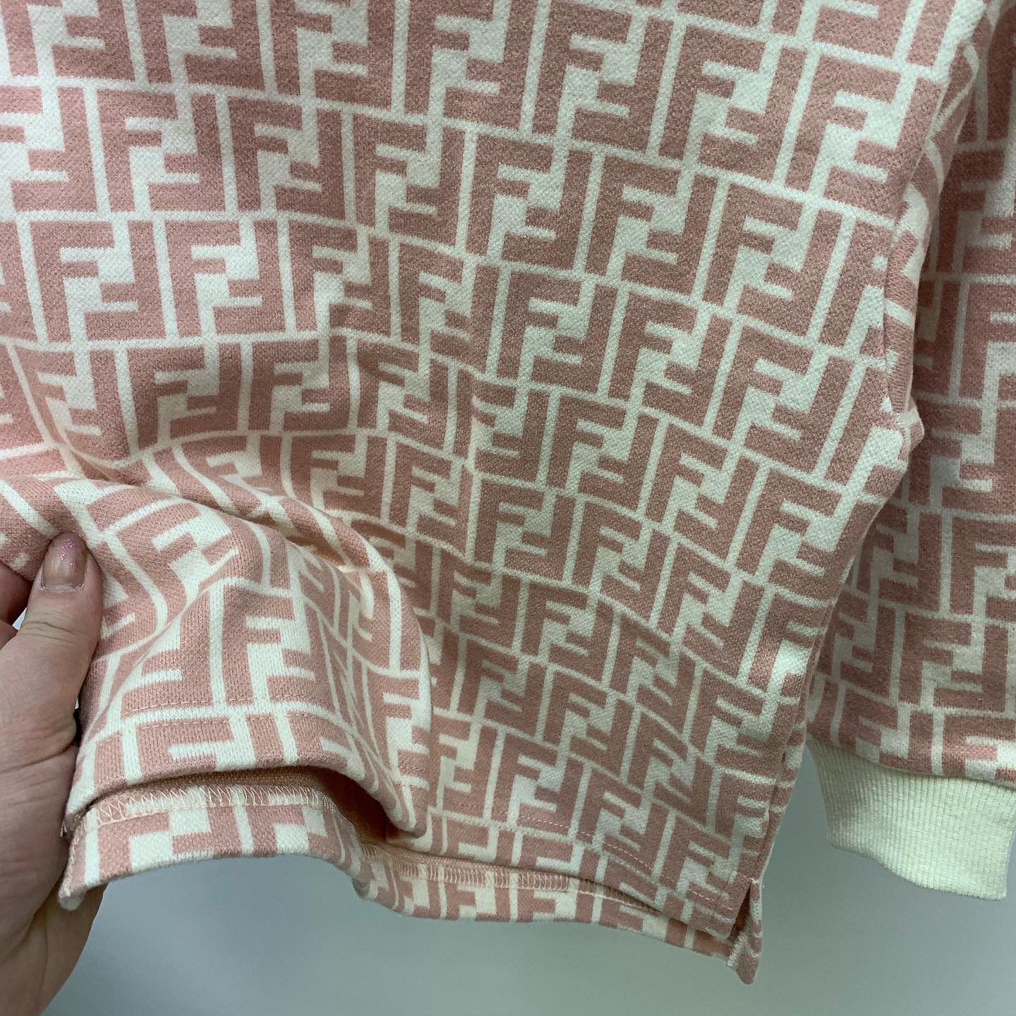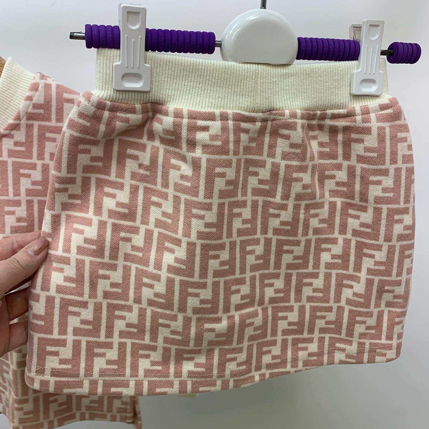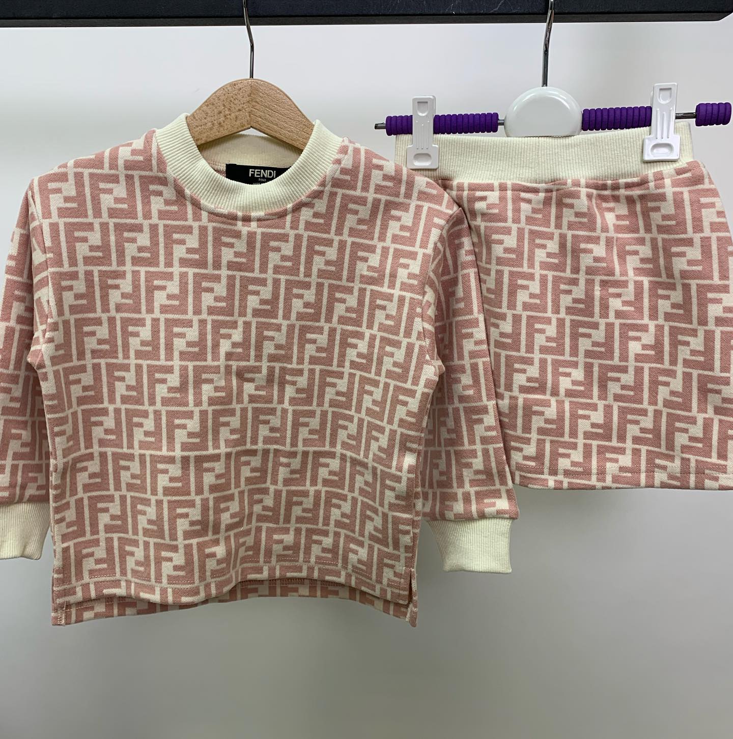 Костюм Fendi LUX-39938 представляет собой изысканный комплект, выполненный в узнаваемом стиле бренда Fendi. Набор состоит из свитшота и юбки, декорированных фирменным монограммным принтом FF. Нежный пудровый оттенок с контрастной кремовой отделкой манжет, воротника и пояса юбки придает изделию особый шарм. Этот стильный костюм отлично подойдет для создания элегантных повседневных образов.