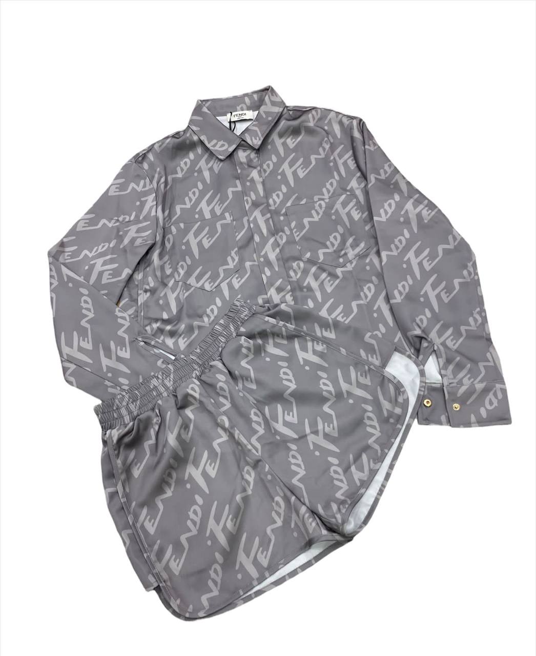Костюм Fendi LUX-70423 — это стильный комплект одежды от известного бренда, состоящий из рубашки и шорт. Костюм выполнен в сером цвете с повторяющимся принтом логотипа Fendi. Ткань имеет легкий блеск и приятную текстуру. Этот костюм подойдет для создания модных и комфортных образов.