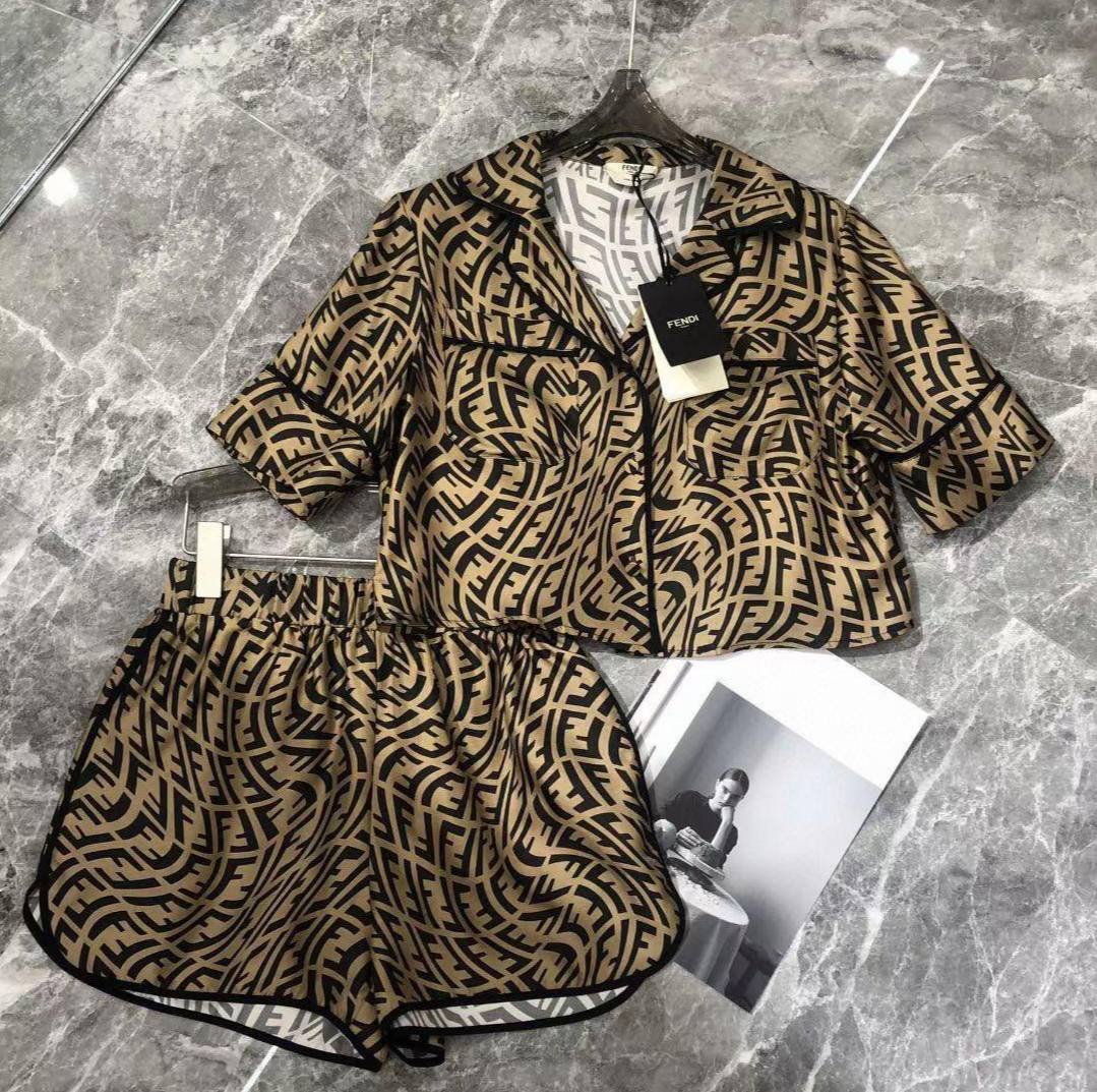 Костюм Fendi LUX-52615 представляет собой стильный комплект, состоящий из рубашки с коротким рукавом и шорт. Дизайн костюма выполнен в узнаваемом стиле бренда Fendi, с характерным монограммным принтом FF на бежевом фоне. Сочетание классической рубашки и удобных шорт создает элегантный и одновременно расслабленный образ. Этот костюм идеально подходит для создания эффектных повседневных или домашних образов.