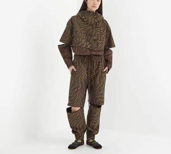 Костюм Fendi LUX-54765 представляет собой комплект спортивной одежды, выполненный в узнаваемом стиле бренда. Верхняя часть выполнена в виде короткой толстовки с капюшоном и рукавами типа "кимоно", украшенной фирменным принтом Fendi. Брюки свободного кроя, с кулиской на талии, также декорированы тем же узором. Дизайн костюма сочетает в себе элементы спортивного шика и высокую моду.