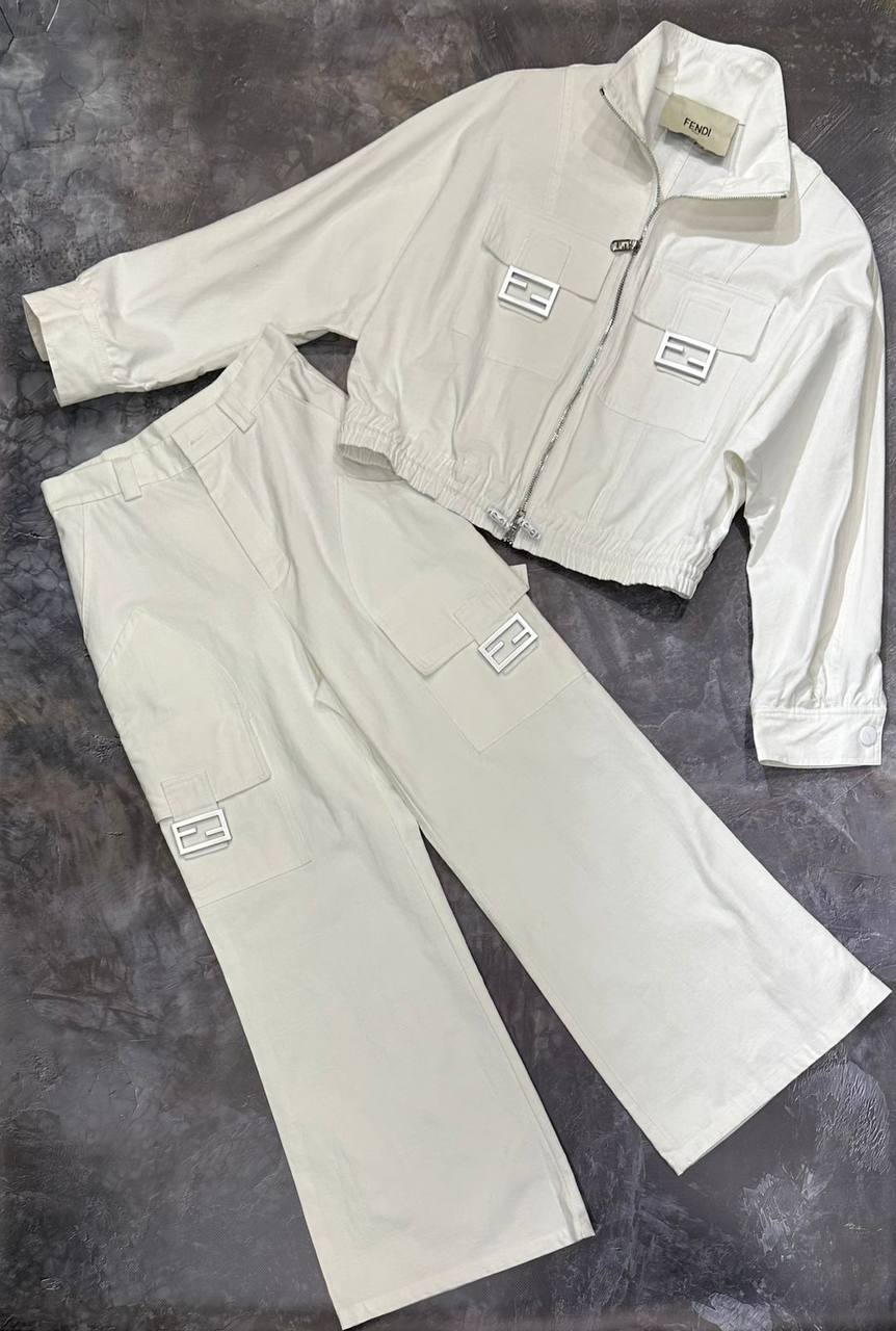 Костюм Fendi LUX-92488 — это стильный комплект в спортивном стиле, состоящий из куртки и брюк. Белый костюм с металлическими деталями на карманах. Идеально подходит для создания модного образа.