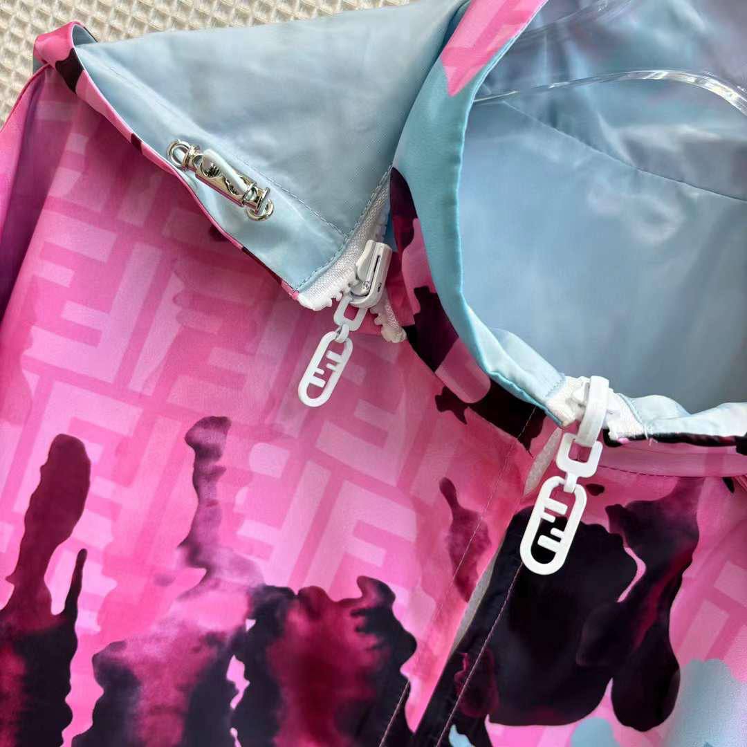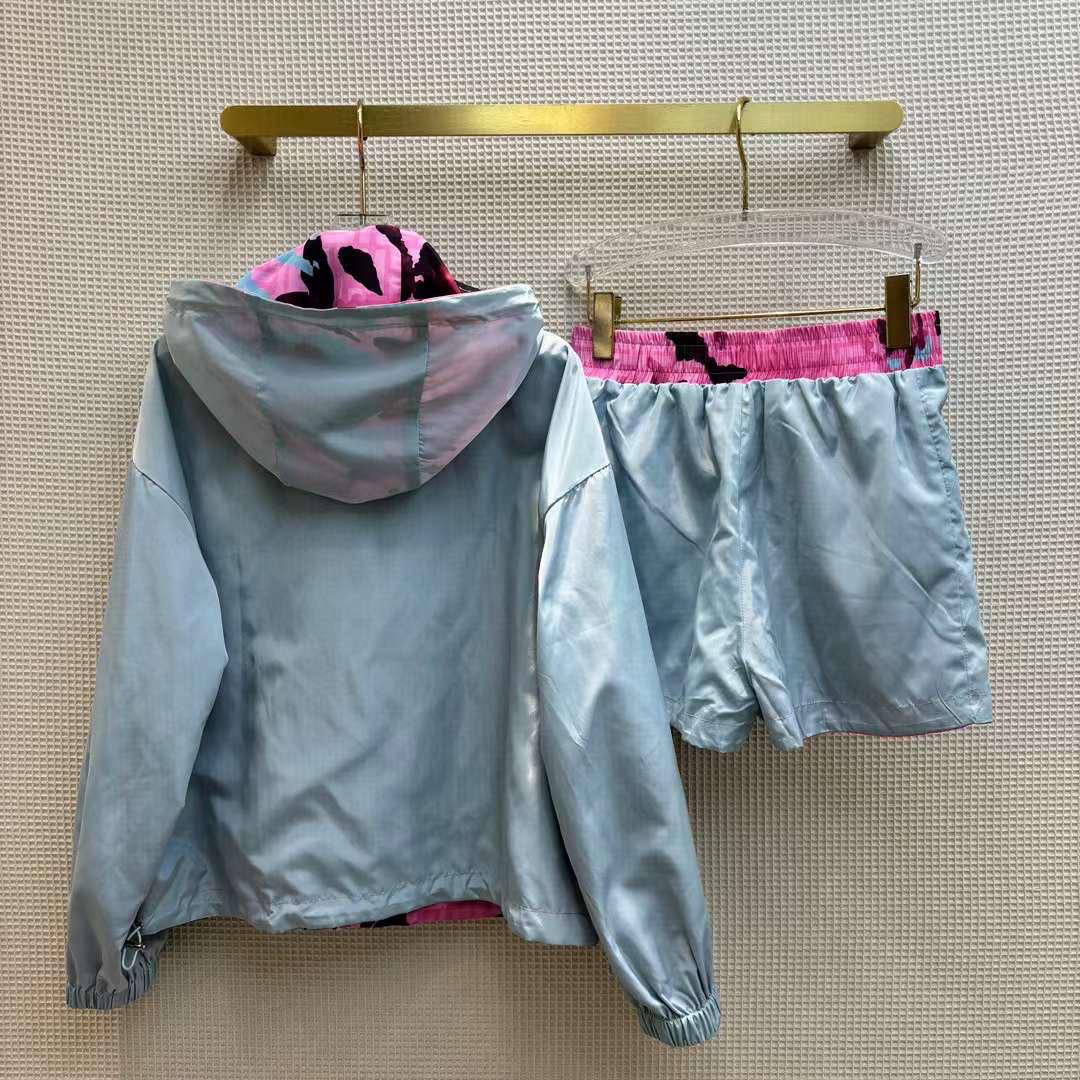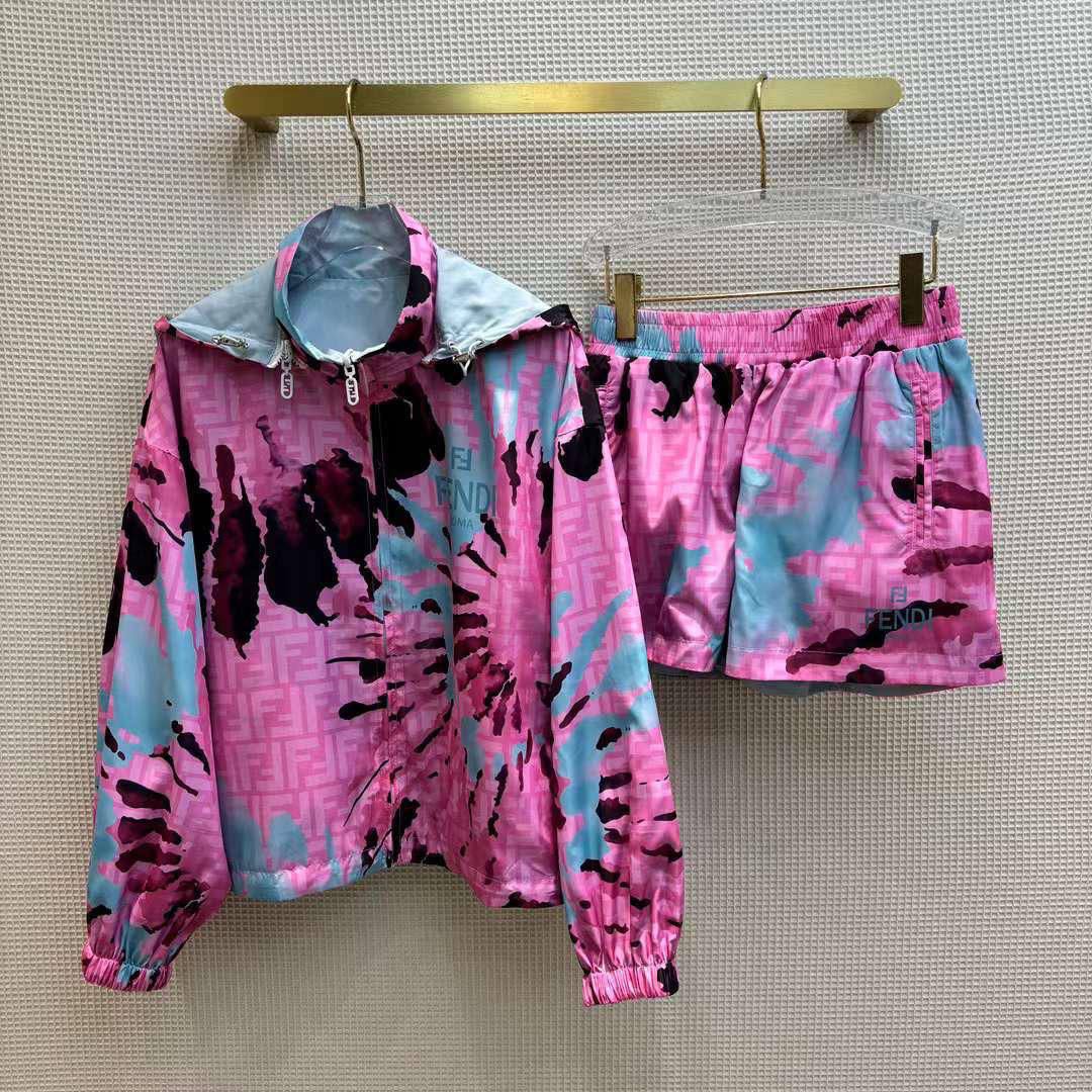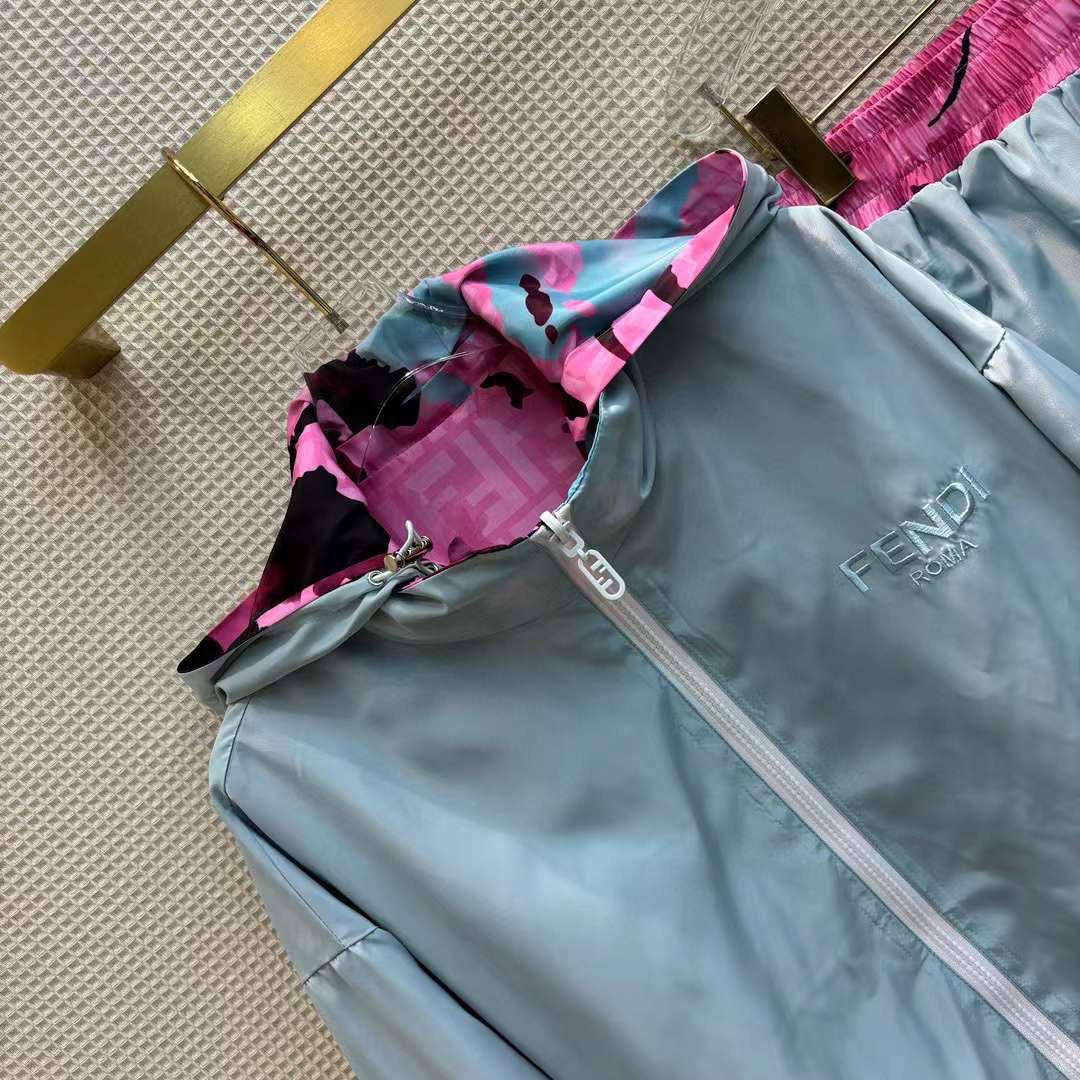 Костюм двухсторонний Fendi LUX-104145 представляет собой стильный комплект, который включает в себя куртку с капюшоном и шорты. Костюм выполнен в ярких цветах: розовом, черном и голубом, что делает его заметным. Прекрасно подойдет для повседневной носки.