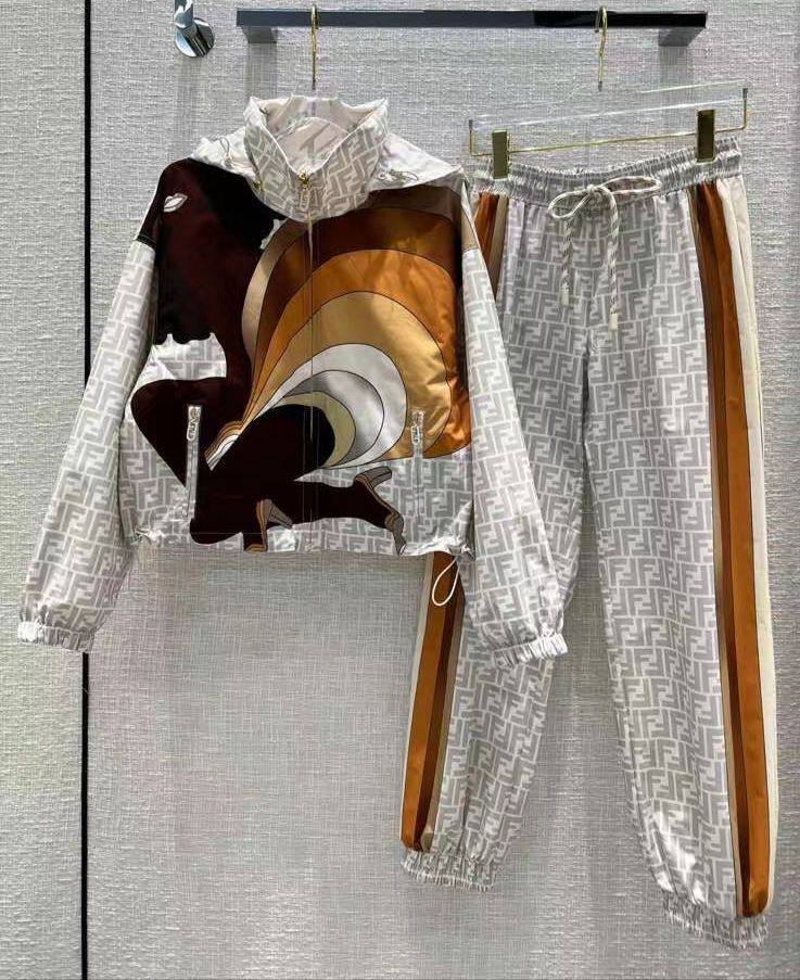 Спортивный костюм Fendi LUX-66986 представляет собой стильный и современный комплект, сочетающий комфорт и узнаваемый дизайн бренда. В дизайне куртки присутствует яркая графика, а штаны декорированы фирменным паттерном FF. Этот костюм идеально подойдет для создания расслабленных, но эффектных образов.